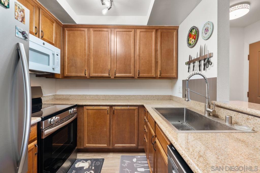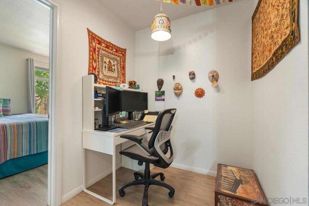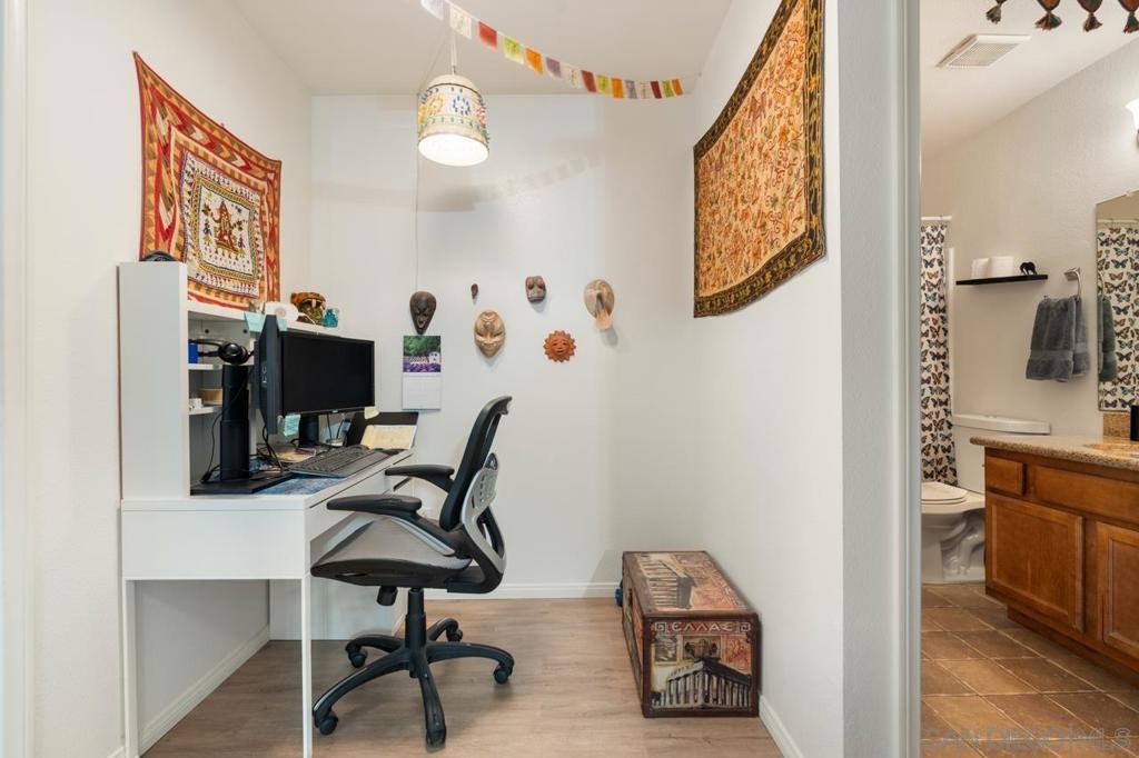 Upgraded Top-Floor 1 bedroom + office Condo within mins to the Beach. Welcome to this beautifully upgraded top-floor condo located in the desirable gated community of Arbor Hill, just 2.5 miles from the beach, minutes to the freeway, Downtown Oceanside and Camp Pendleton. This light-filled, open plan unit features modern flooring throughout, a spacious kitchen with granite countertops, newer appliances, and a stylish farmhouse sink. Private balcony with a convenient storage closet, perfect for relaxing or entertaining. The bedroom offers a generous walk-in closet, while the versatile bonus room makes an ideal home office or nursery. Assigned undercover parking space and resort-style amenities including a pool, spa, gym, and BBQ area. With VA approval, this home offers both value and convenience in a prime coastal location. This is a wonderful turnkey condo in one of Oceanside’s most convenient gated communities! Within a short distance to shops and public transportation. Water, sewer, trash and building maintenance are covered in the HOA fee.
