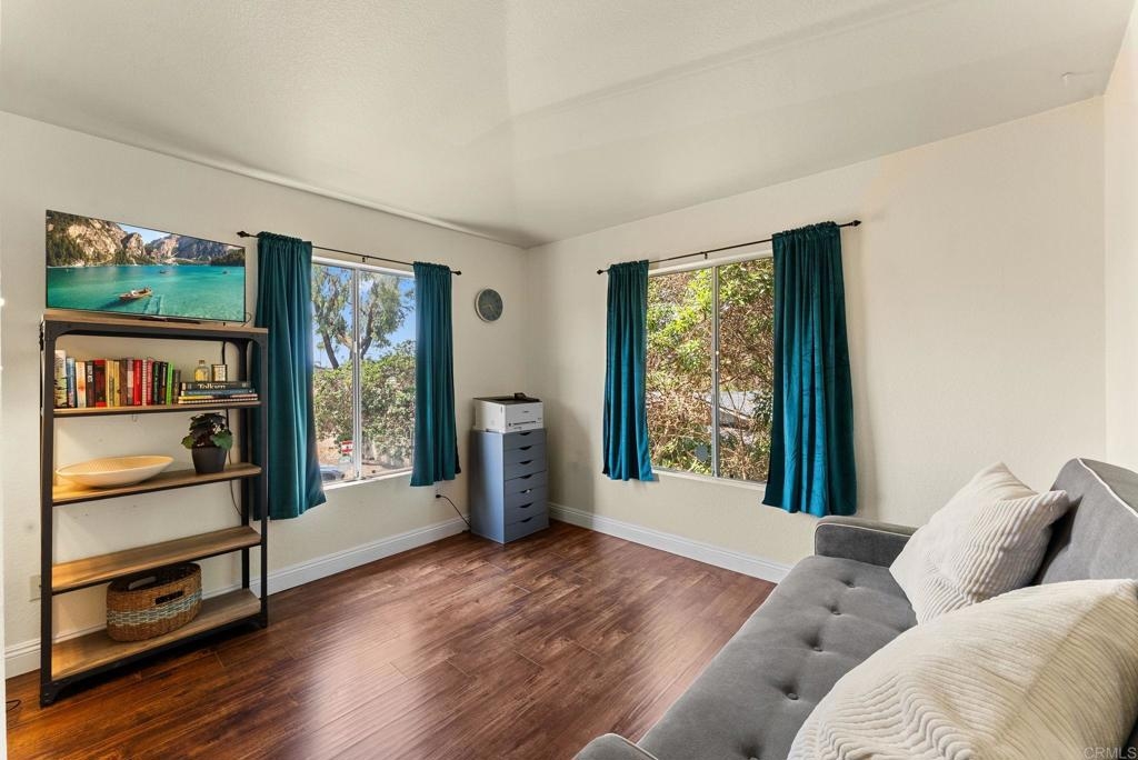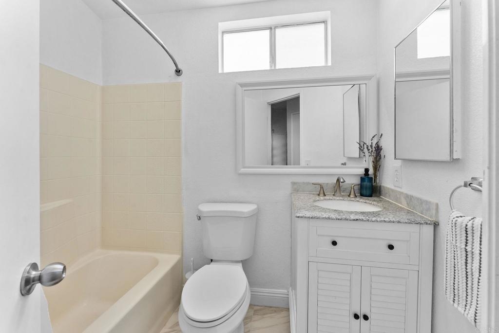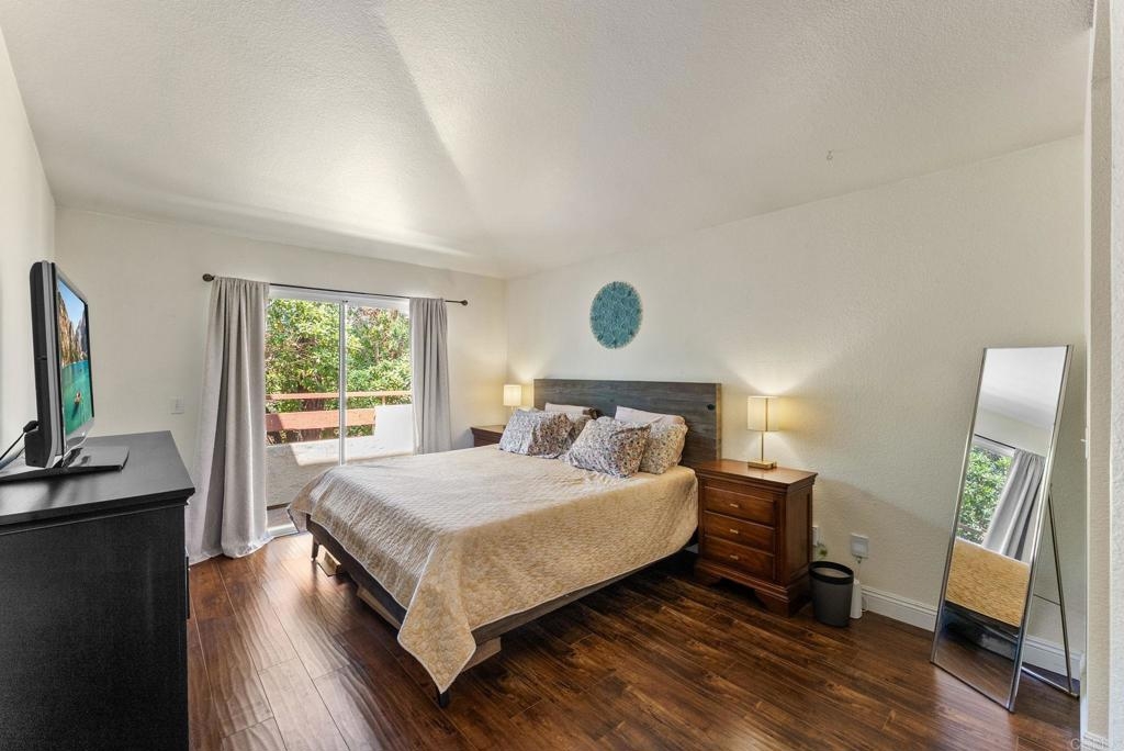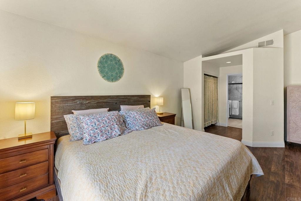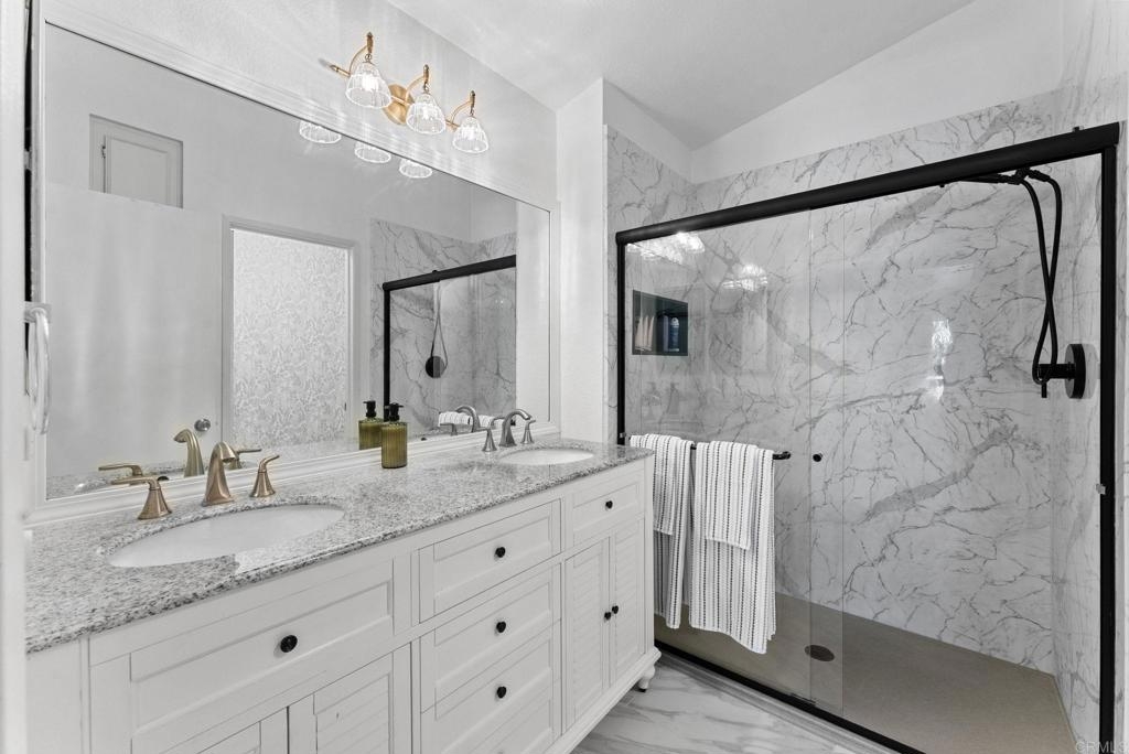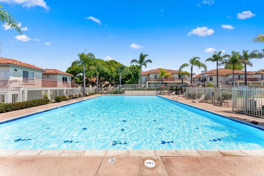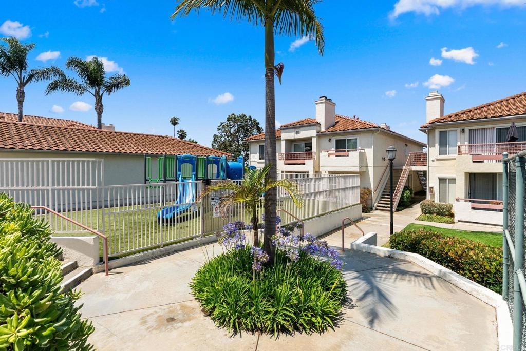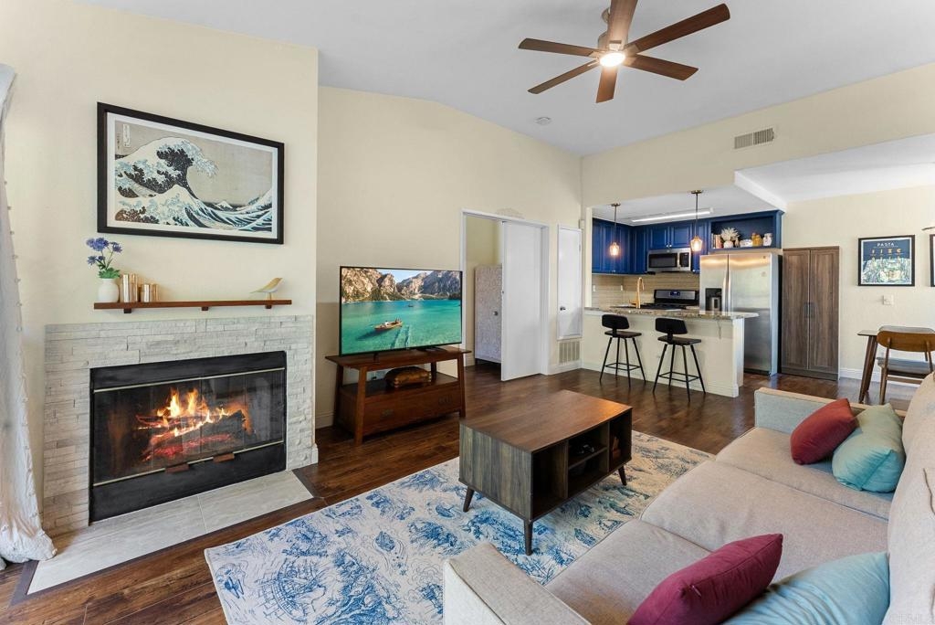 Modern Coastal Living in Eagles Crossing – Move-In Ready! Welcome to this beautifully upgraded top-floor condo nestled in the highly desirable Eagles Crossing community of Oceanside. This bright and open 2-bedroom, 2-bath residence boasts soaring vaulted ceilings and thoughtful finishes throughout. The kitchen is a true standout with custom two-tone cabinetry, sleek stainless steel appliances, a stylish tile backsplash, and stunning granite countertops with bar seating — perfect for entertaining. Relax in the spacious living room, complete with a cozy fireplace and large sliding glass doors that open to a private balcony surrounded by lush greenery, offering privacy and a peaceful outdoor escape. The generous primary suite includes balcony access, a large closet, and direct access to the updated bathroom featuring a double vanity and an elegant walk-in shower with custom tilework. Additional features include in-unit laundry, central heat, and modern light fixtures. The Eagles Crossing community offers beautifully maintained grounds, and this unit is just steps from the greenbelt and walking paths. Conveniently located near shopping, dining, and just a short drive to the beach and Oceanside’s thriving coastal scene. Whether you're a first-time buyer, downsizing, or looking for a great investment, this home is a must-see!