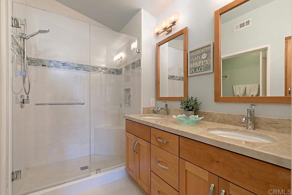 NO MORE SHOWINGS. MULTIPLE OFFERS ARE IN. THANK YOU! Relax and enjoy this HIGHLY UPGRADED upstairs corner unit with high vaulted ceilings and wood flooring in the Avalon Community in beautiful Oceanside. Double balconies with peak ocean views provide delightful afternoon sunsets. Custom kitchen and bathrooms are designed with a stunning coastal elegance. The chef in you will love the Extended Natural quartzite counter with waterfall island, soft closing cabinets with extra pantry, new SS appliances, large gas burning stove with center griddle and added counter space for gourmet and family meal prep. Dual slide out spice cabinets and two corner lazy Susan cabinets add space and convenience to this brilliantly designed kitchen. Both full bathroom remodels are bright and light with glass doors and designer touches. New AC unit keeps you cool during the warm summer months. Head outside of this wonderful home and bike to the beach, swim in the enormous pool or enjoy a game of tennis on the Avalon court. Mature trees surround the beautiful walking paths meandering through the neighborhood. Enjoy the local flavor at restaurants and coffee shops nearby. Hop on the 5 freeway for quick access to your weekend adventures. Return home to your one car garage and extra parking space for guests. And for those of you who work remotely, there is a dedicated office space with ample light and a resort style view. Welcome home!