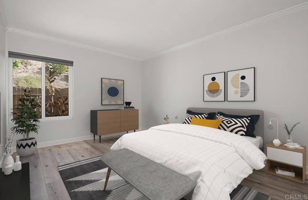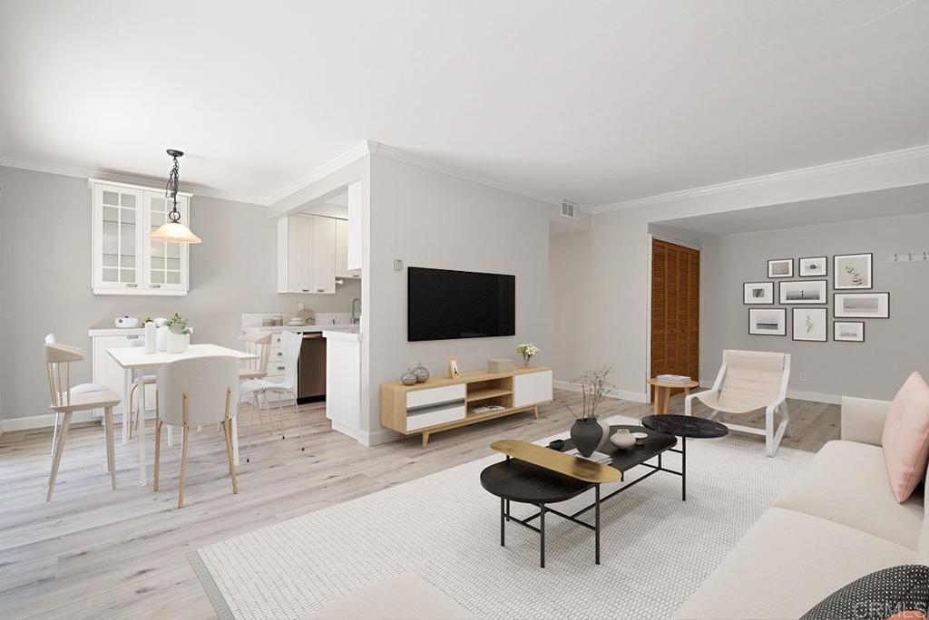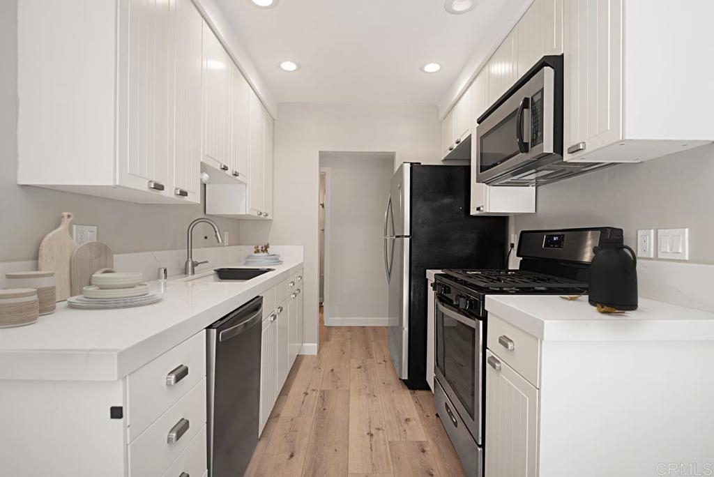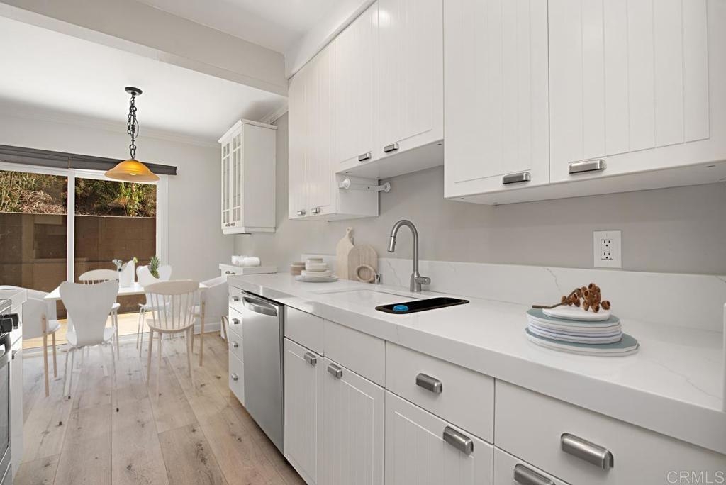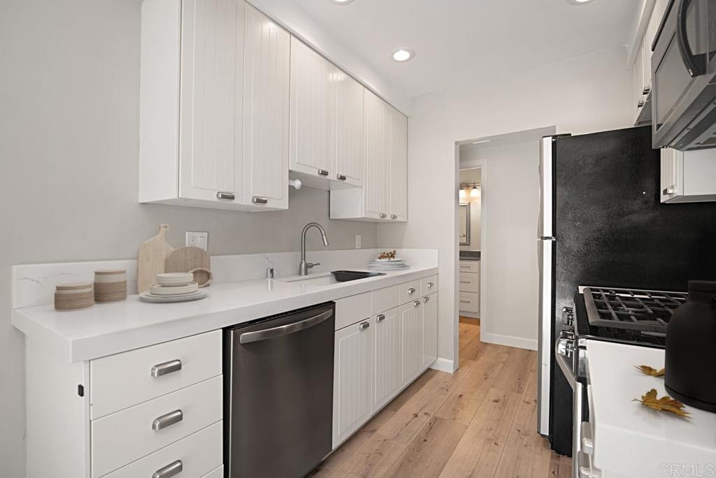 UPGRADED! Enjoy coastal breezes in this move-in ready condo in the Fire Mountain community! One of the larger 1st-floor units, boasting 2 BD, 1BA, and 1,015 sqft. The galley-style kitchen features new shaker-style cabinets, quartz countertops, stainless steel appliances, a gas stove, and an eating area. Vinyl plank flooring and crown molding throughout. Craftsman-style baseboards. Dual pain windows. Shaker-style bathroom vanity with granite countertop. Each bedroom has walk-in closets. Enjoy a private spacious outdoor patio/yard. 2 parking spaces (carport with storage and 1 uncovered space). Steps to the laundry facility. The community features a gated community pool. The location is surrounded by great restaurants, endless shopping opportunities, only 3.5 mi from the beach, with easy access to the freeways.