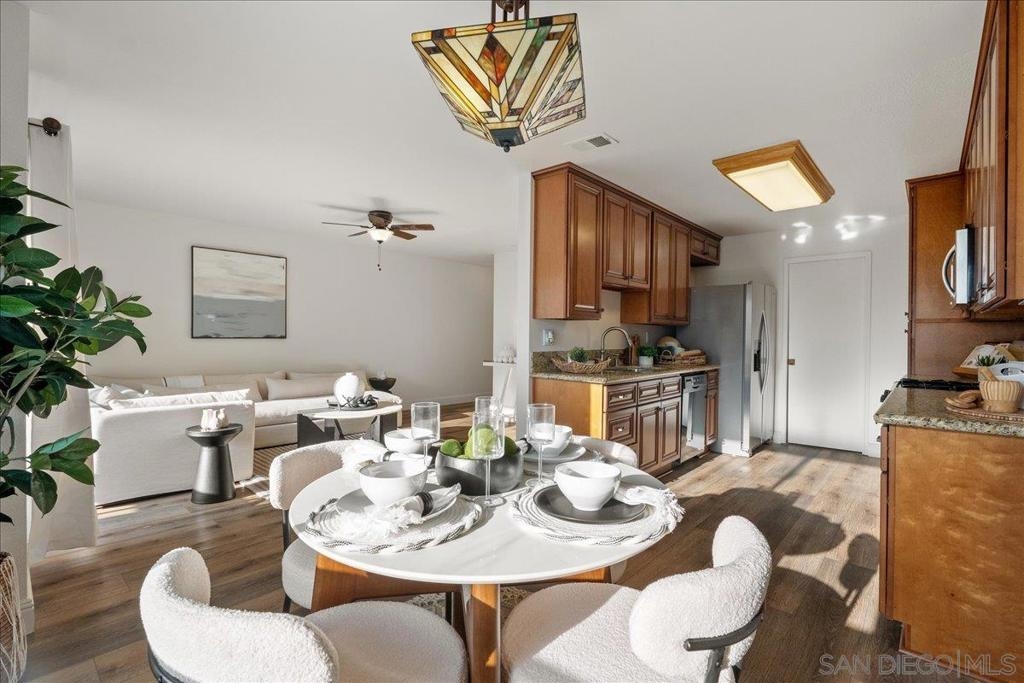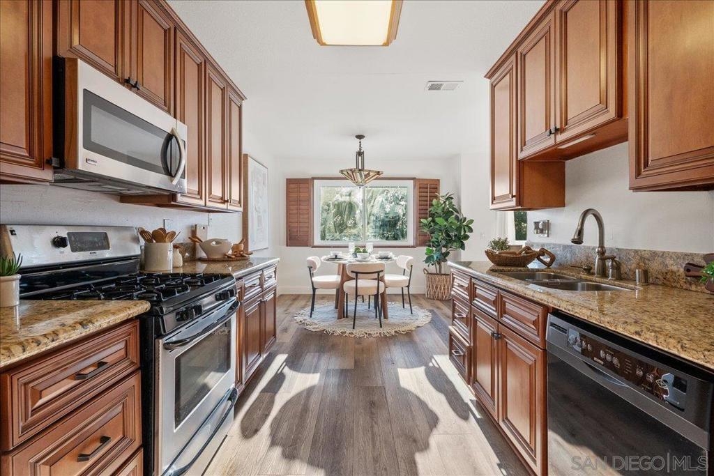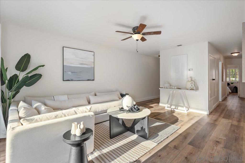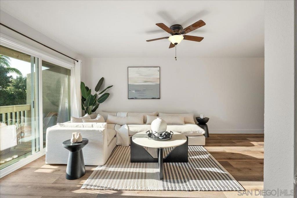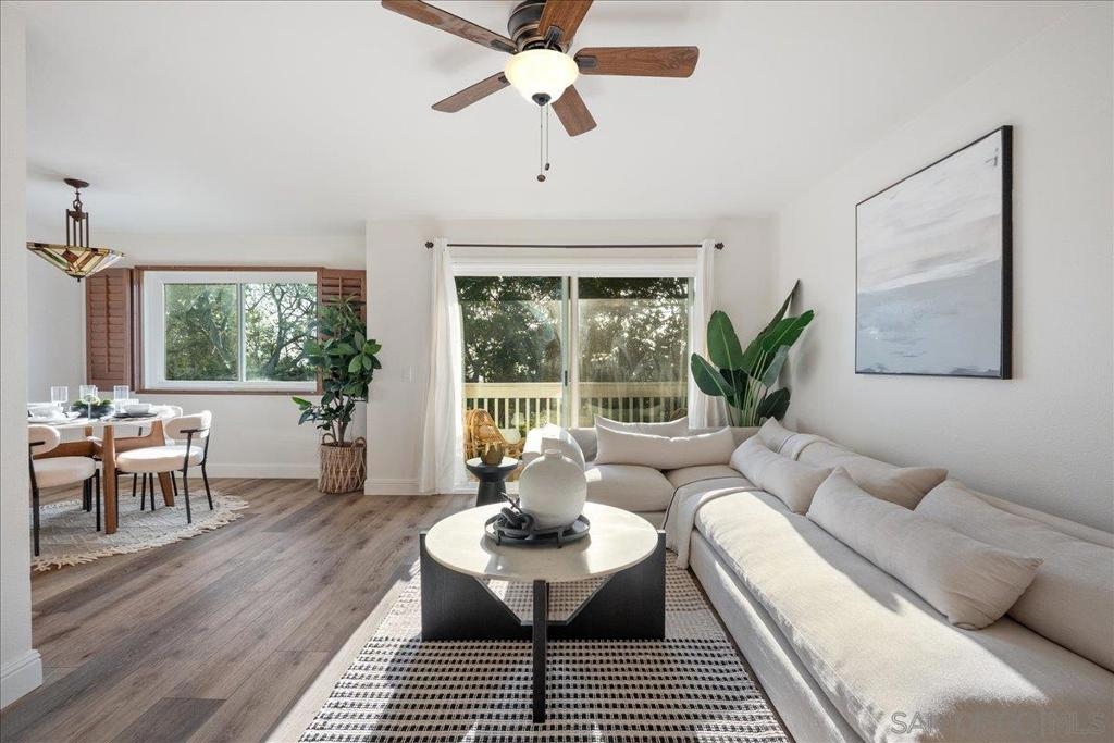VA approved and move-in ready, this bright and breezy 2 bed, 2 bath upstairs condo offers peaceful west-facing views overlooking the greenbelt, with no neighbors above or behind. The open and airy floor plan features wide-plank luxury vinyl flooring throughout, fresh paint, and an updated kitchen that flows seamlessly into the living and dining areas, filled with natural light. The home includes a private 1-car garage and is located in a well-maintained community with lush landscaping, walking paths, and a sparkling pool and spa. HOA dues cover water, sewer, trash, exterior maintenance, and access to all community amenities. Ideally situated just 6 miles from the beach with easy access to Hwy 76, I-5, and 78, this location is perfect for commuters, first-time buyers, or anyone looking to enjoy the best of Oceanside living. Zoned for highly rated schools including Ivey Ranch Elementary, Martin Luther King Jr. Middle School, and El Camino High School.