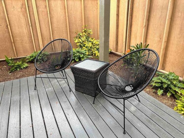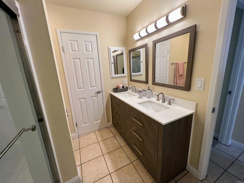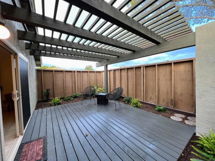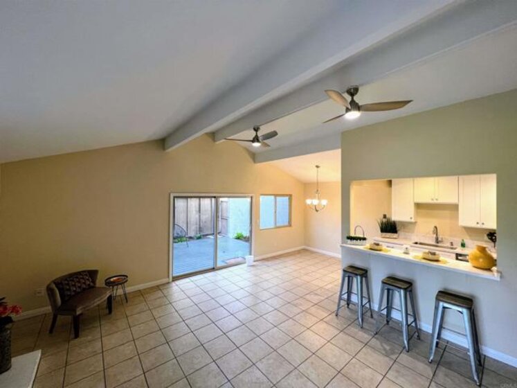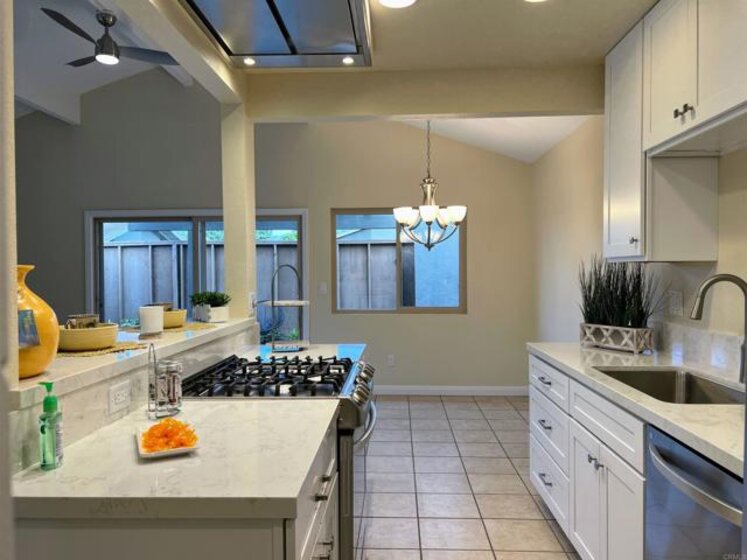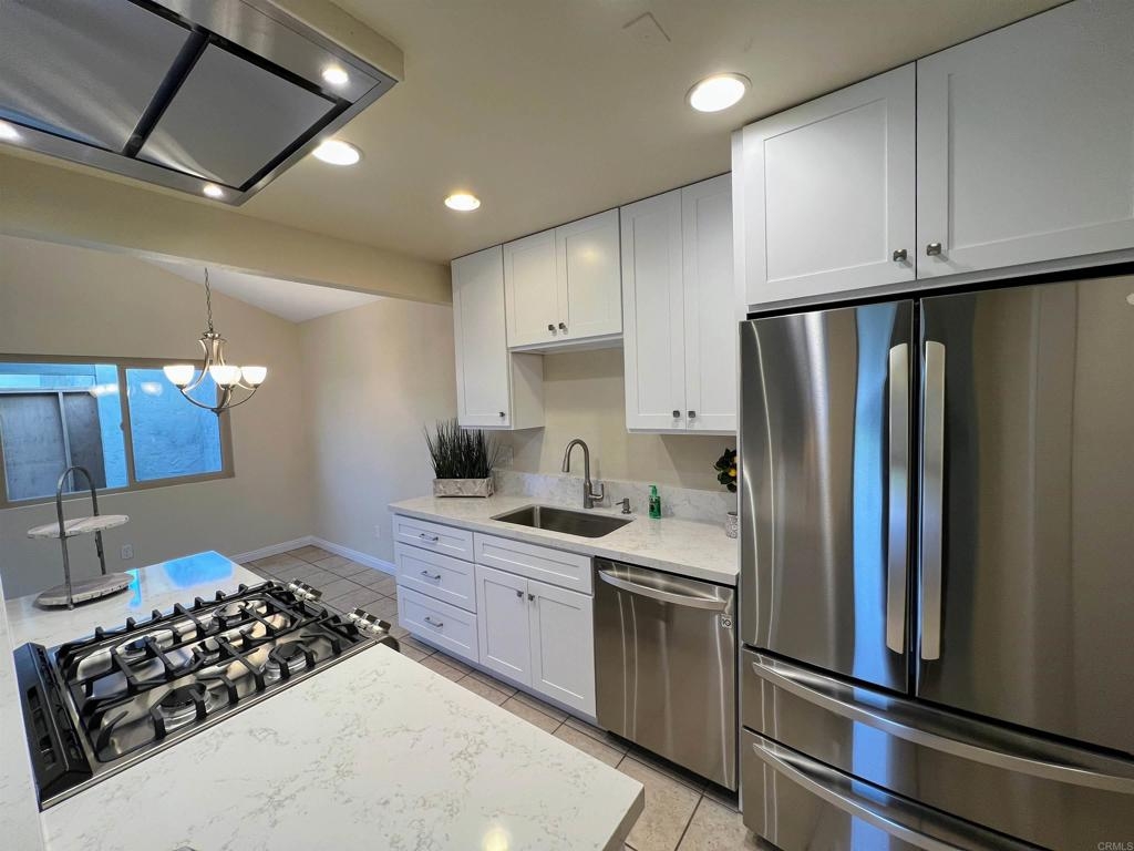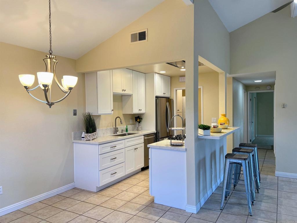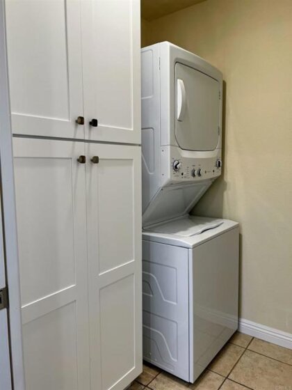 Beautiful remodeled 2 bed 1 bath with open kitchen and lots of light. Spacious living room has a gas log fireplace with porcelain tile flooring. Kitchen features solid plywood cabinetry with easy close drawers, doors and pull out pan drawers. Quartz countertops and bar. Recessed overhead exhaust fan and range lighting. Kitchen has new upgraded LG appliances and a single stainless sink. The laundry room has a pocket door off the kitchen with a new GE stacked washer/dryer. 24 inch wide linen cabinet and pantry with outlets inside and pull out shelves. Step out to your own private back patio with beautifully landscaped plants and a timed irrigation system. Bedrooms have new carpet. Master bedroom has a generous walk-in closet. Bathroom has a sliding glass door to the shower with dual sinks. New 4 1/2 inch baseboards throughout the home. Appliances are included.