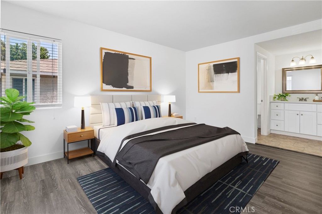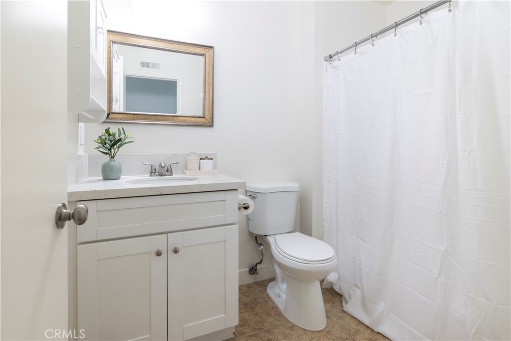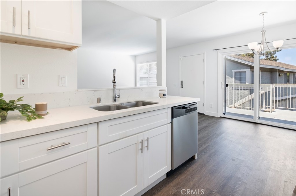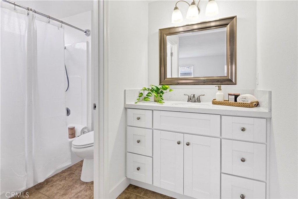 VA Approved! This highly desirable upper level Whelan Ranch, Oceanside home is tastefully upgraded, all single level with no one above or below, and is an end unit with quick access to the community pool. As you step up to this beautiful condo, the patio/deck invites you into a home filled with abundant natural light that has been recently painted throughout, is updated with LVP flooring, vinyl windows, and has an open floor plan that seamlessly flows from the living room, to the dining area, to the kitchen. The kitchen boasts quartz countertops, upgraded white shaker cabinets, recessed lighting, and stainless steel appliances including a brand new dishwasher. The primary bedroom features an en-suite bathroom with quartz countertops and a spacious walk-in closet. The hallway bathroom is equally stunning with quartz countertops and a full bathtub with a shower. Convenience is key with the laundry room located inside the unit! Additionally, this home comes with a spacious single car garage directly below the unit complete with dedicated parking. The HOA fee covers common area landscaping, water, and trash! Embrace the indulgent lifestyle that Whelan Ranch has to offer with the beach just 7 miles away! Relax and grill on your deck, take a dip in the community pool, or explore the nearby trails for hiking or biking the San Luis Rey Trail. The community exudes a secluded feel with mature landscaping and trees, yet is just a stone's throw away from Camp Pendleton, Oceanside pier and harbor, golf courses, fishing spots, restaurants, shopping centers, and schools. Don't miss the opportunity to make this stunning Whelan Ranch condo your own! This is truly a rare find in beautiful Oceanside in a sought-after location, so schedule a viewing today before it's gone!