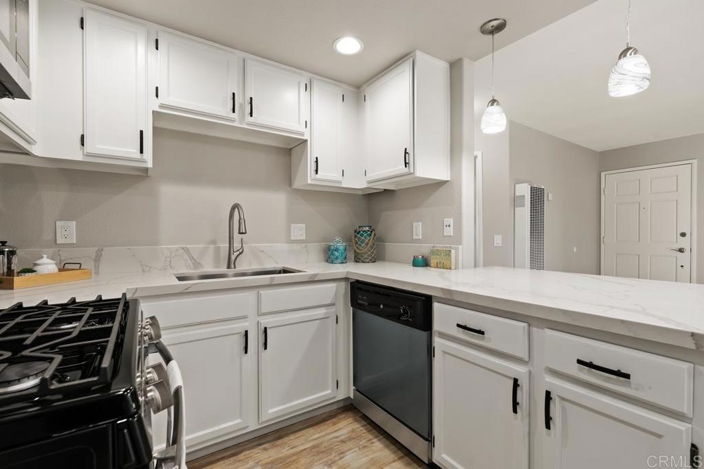 Offered for $499,000-$539,000! Live the ultimate beach lifestyle in this beautifully renovated second floor single-level 1BR/1BA, located in gated Silver Surf Gardens! Recently updated with new LVP flooring & baseboards and a stunning kitchen with white quartz countertops, new sink & faucet, and stainless steel appliances! Freshly painted throughout, including kitchen cabinets! New ceiling fans in living room & bedroom, new light fixtures, and new carpet in the bedroom! Bathroom sink, faucets, hardware, framed mirror, and window cover have all been updated. Wall heater was just replaced, and there is stackable laundry in the unit! Large balcony with new epoxy painted flooring! Plus, a brand new sliding door is scheduled to be installed in March, paid for by the sellers! Gated parking includes one assigned & covered space. Fabulous location only a few blocks to the beach & pier! Enjoy all that downtown Oceanside has to offer with restaurants, theatre, shops, transportation, beautiful harbor and more!