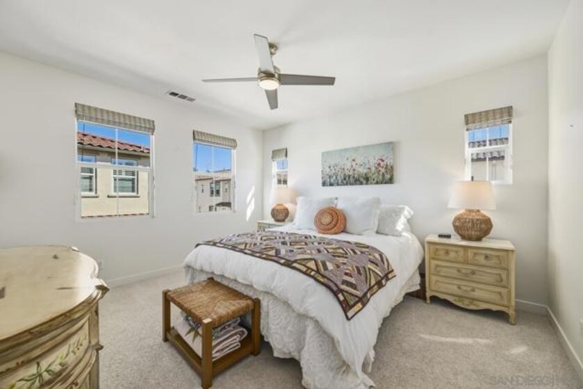 Welcome to this stunning end-unit townhome with a private entrance, located in the highly desirable gated community of St. Cloud within Ivey Ranch, Oceanside. This beautifully maintained home offers the perfect blend of modern upgrades, functional layout, and resort-style living just minutes from the beach, harbor, shopping, dining, golf, and convenient freeway access to Highways 76, 78, and I-5. Step inside to find an inviting open floor plan featuring luxury vinyl plank flooring throughout and newer carpet on the stairs and upper bedrooms. The chef’s kitchen showcases crisp white cabinetry, quartz countertops, a subway tile backsplash, stainless steel appliances, a gas range, and a pantry—all with a lovely view of the pool. Enjoy outdoor living on the private balcony just off the dining area, perfect for a BBQ or morning coffee overlooking the community. The home offers four spacious bedrooms and four full bathrooms, including a first-floor bedroom with an ensuite bath, ideal for guests or a home office. The main level features a bedroom, full bath, kitchen, dining, and living areas for easy everyday living. Upstairs, you'll find two additional bedrooms, each with its own ensuite bath. The primary suite features a large walk-in shower with custom tile work, white vanities, and quartz countertops in all bathrooms for a cohesive modern look. Additional highlights include an attached two-car 240V EV-ready garage, resort-style community pool and spa, and secure gated entry. FHA and VA Approved! Perfectly positioned across the street from Martin Luther King Jr. Park, which offers a skate park, baseball fields, soccer fields, and a tot lot, this home provides exceptional recreation options right at your doorstep. Experience the best of coastal living with comfort, style, and convenience all in one beautiful package!