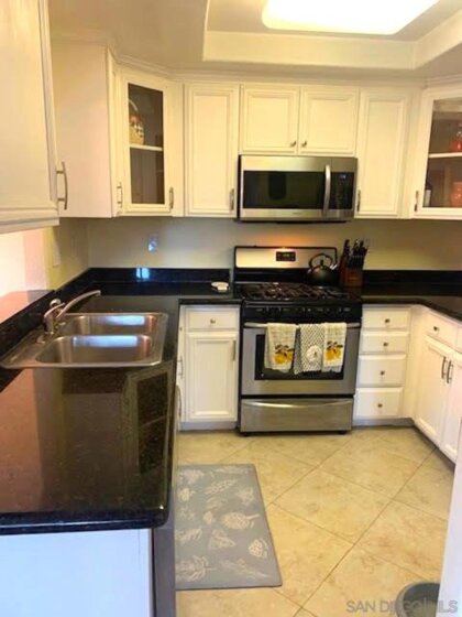 Great opportunity to own a ground floor unit in the gated community of Stonemark. Easy access to all schools, eateries, and shopping. End Unit with 2 bedrooms and 2 full baths. All rooms Freshly painted with tile floors throughout. Granite Kitchen counters with new cabinets, dishwasher and microwave. Upgraded bathrooms with tile floors. Crown molding in the living room and dining room. Covered patio off the living room has a laundry closet with NEW full size washer and dryer. 1 Car Garage and 1 assigned parking space close by. Complex features a pool, spa, workout room and BBQ area and is GATED. Sewer: Sewer Connected Topography: LL
