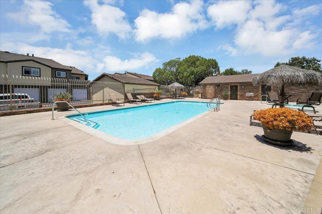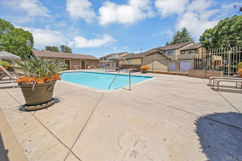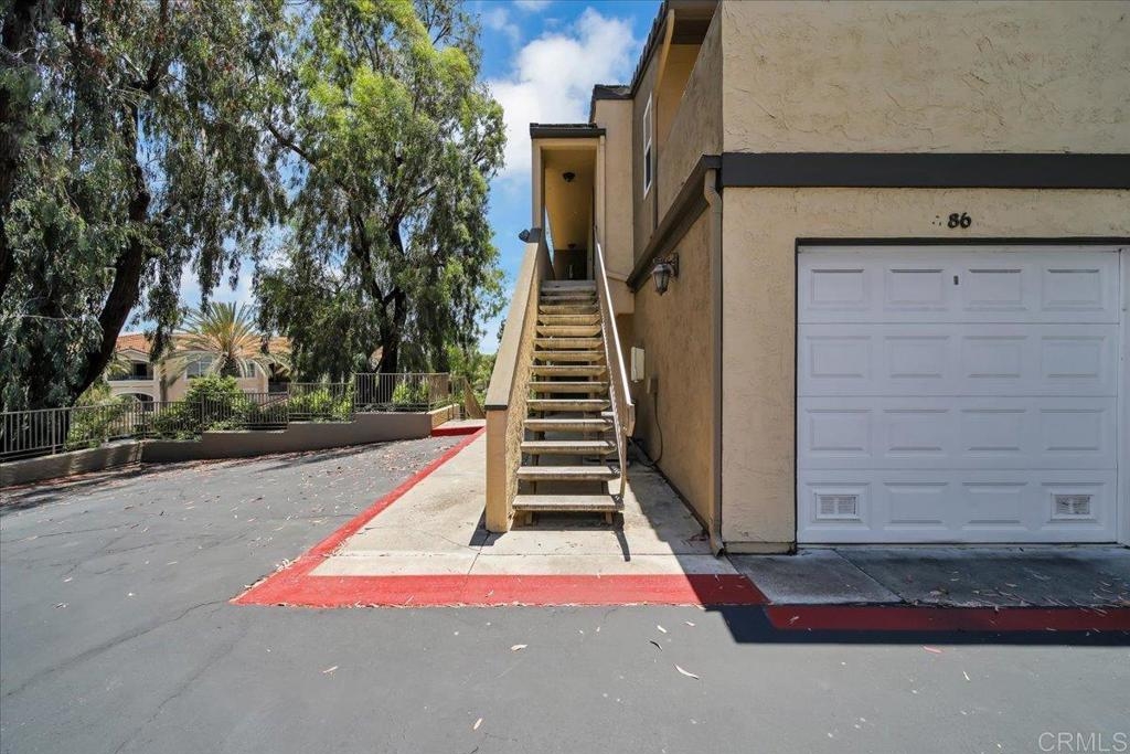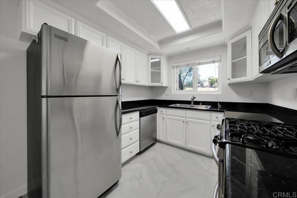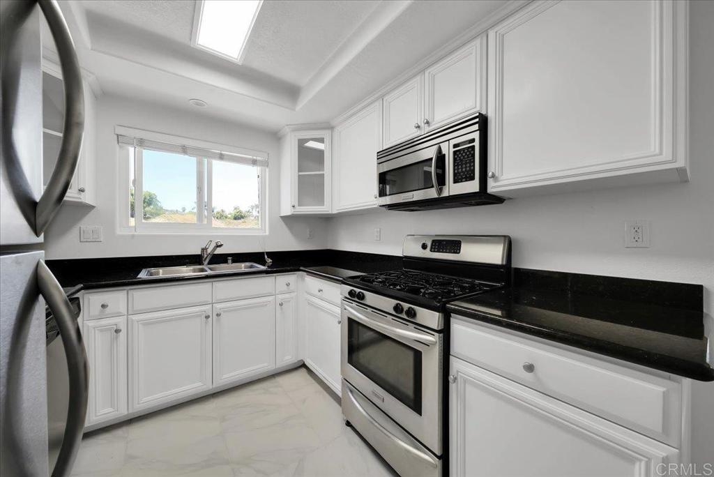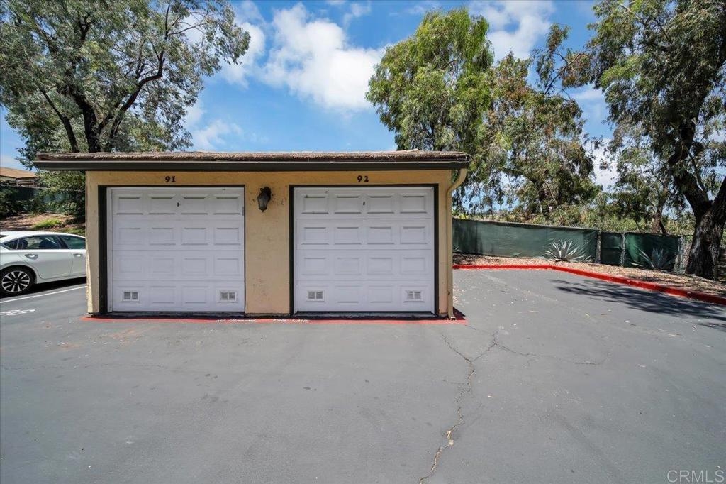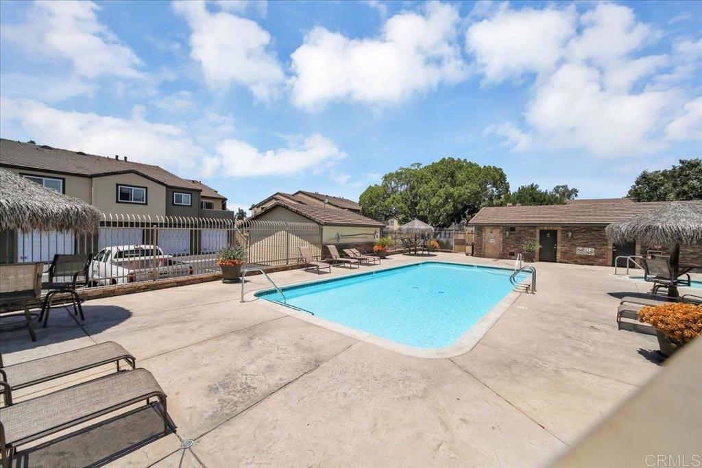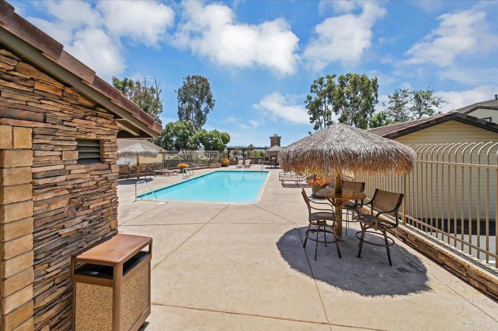 Gated community. Upper end unit with a view to the north. Well kept & quiet development. One bedroom, one bath. Newer Central AC & heat, dual pane windows, vaulted ceiling in great room with crown molding, one car detached garage and one assigned parking space. Kitchen upgraded with granite countertops and stainless steel appliances. New dishwasher installed July 2023. Bathroom remodeled with full size step-in shower. Ceiling fans in bedroom and living room. Stacked washer and dryer convey. Private patio off of living room with view. HOA includes water, sewer, trash, gated entrance, gym/exercise room, pool, jacuzzi, BBQ, outdoor fireplace, tot lot, building and grounds maintenance. Biking/jogging/walking path direct to the ocean, Camp Pendleton, beach, and parks close-by.