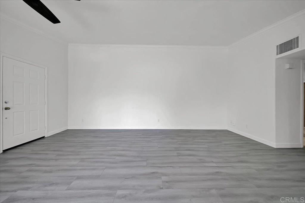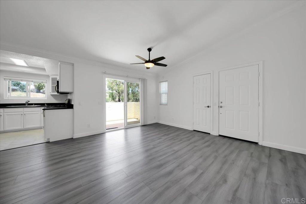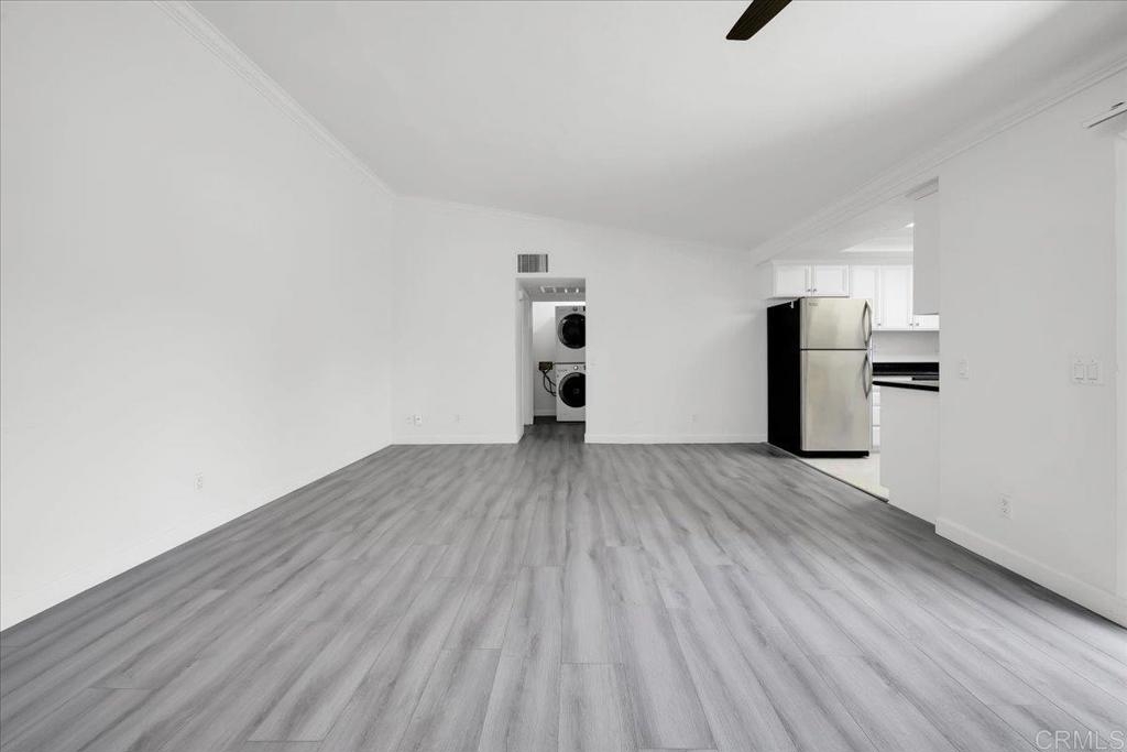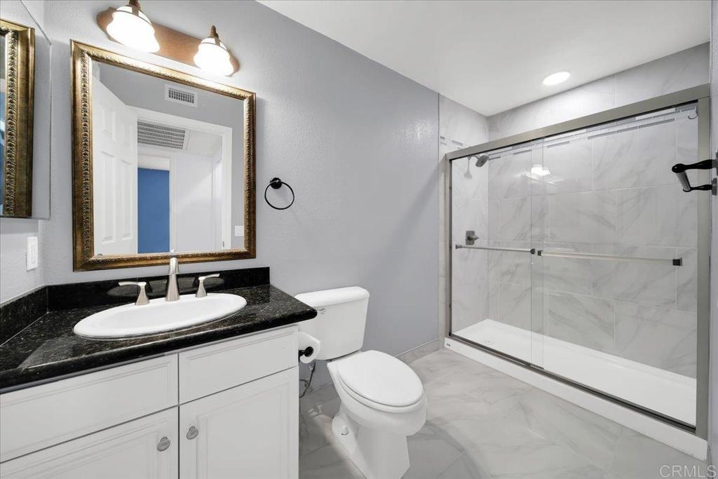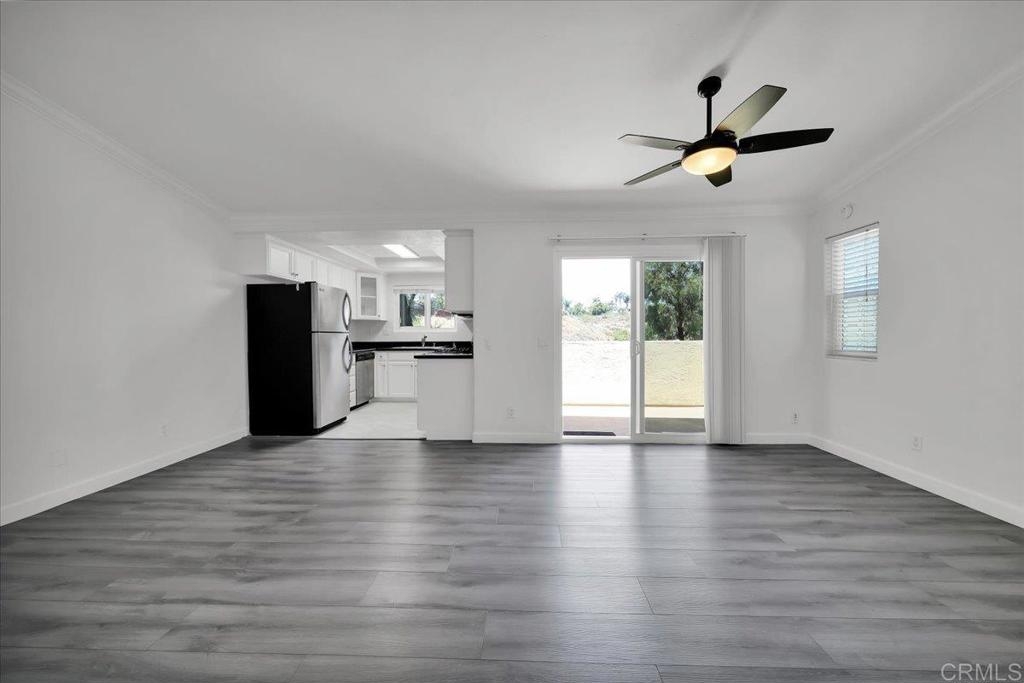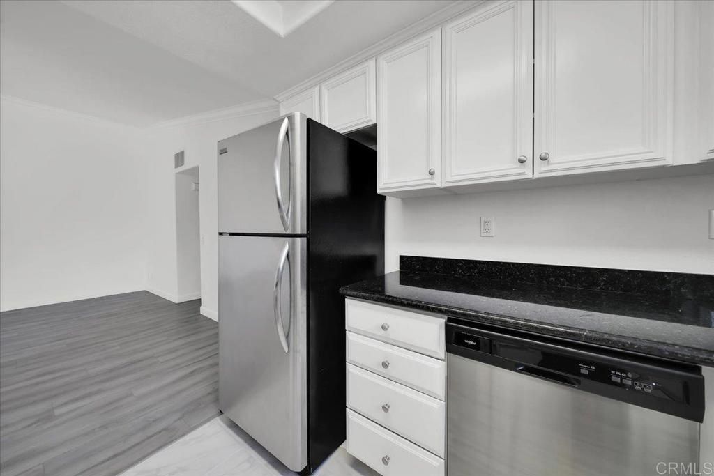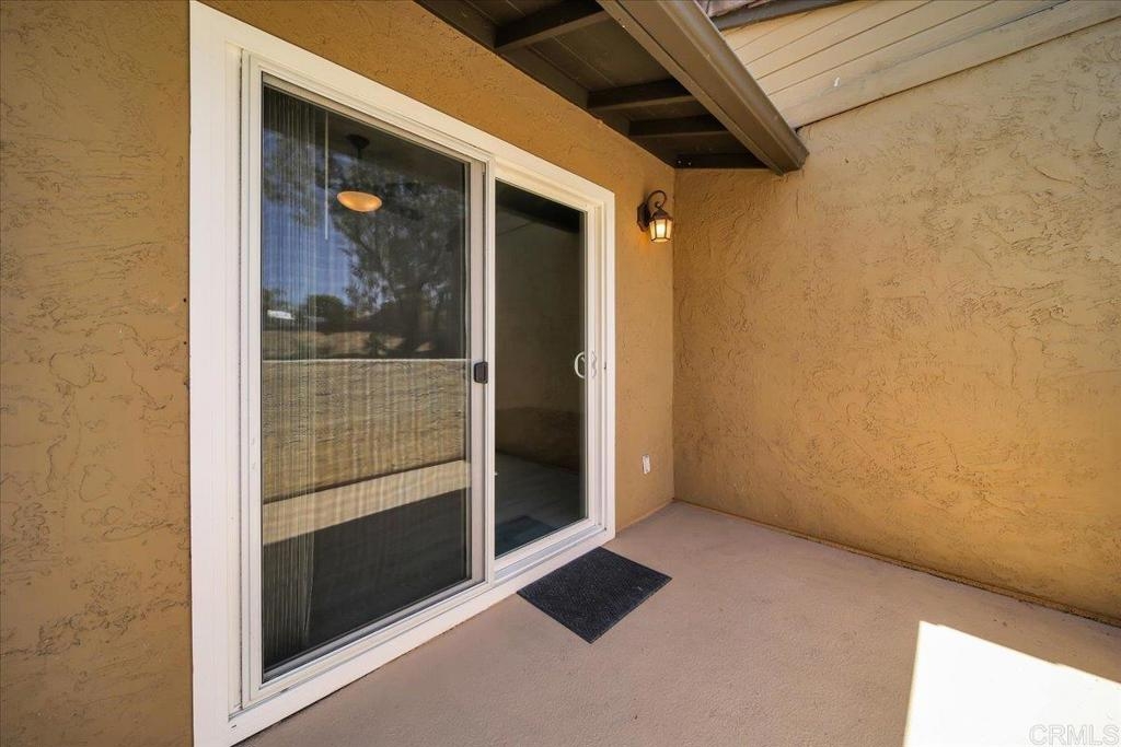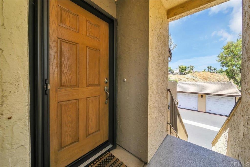 Gated community. Upper end unit with a view to the north. Well kept & quiet development. One bedroom, one bath. Newer Central AC & heat, dual pane windows, vaulted ceiling in great room with crown molding, one car detached garage and one assigned parking space. Kitchen upgraded with granite countertops and stainless steel appliances. New dishwasher installed July 2023. Bathroom remodeled with full size step-in shower. Ceiling fans in bedroom and living room. Stacked washer and dryer convey. Private patio off of living room with view. HOA includes water, sewer, trash, gated entrance, gym/exercise room, pool, jacuzzi, BBQ, outdoor fireplace, tot lot, building and grounds maintenance. Biking/jogging/walking path direct to the ocean, Camp Pendleton, beach, and parks close-by.