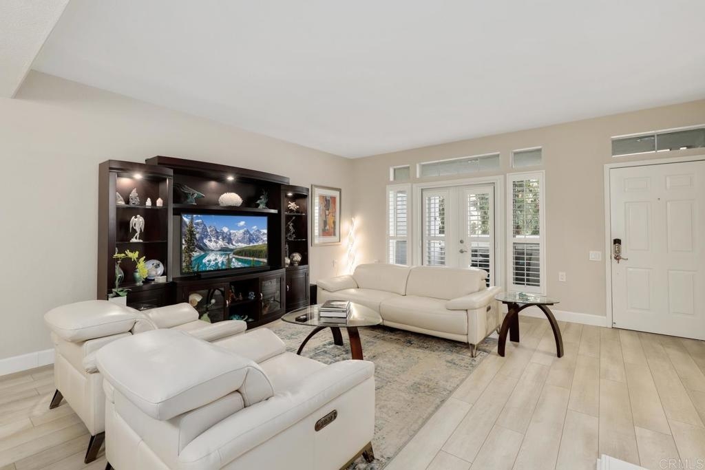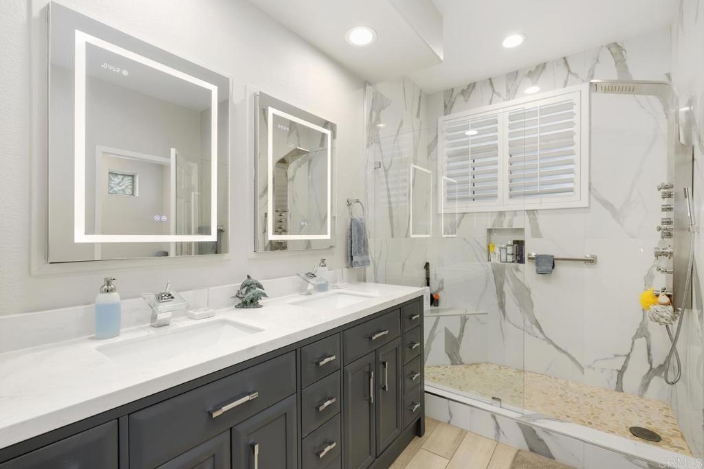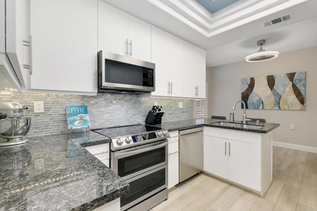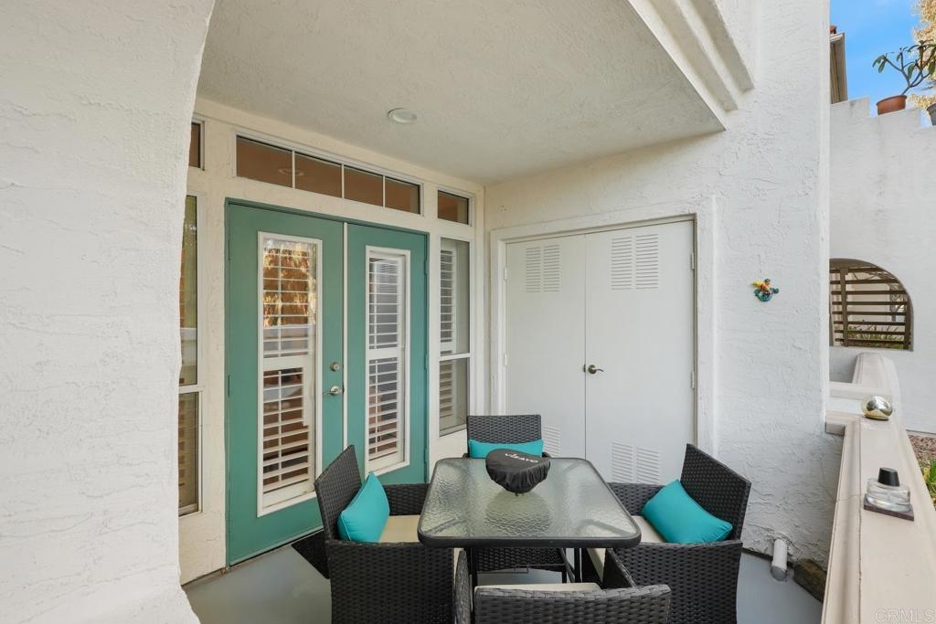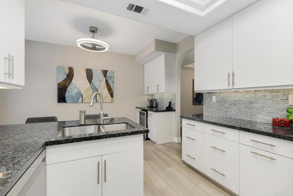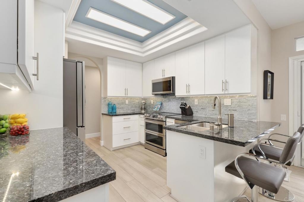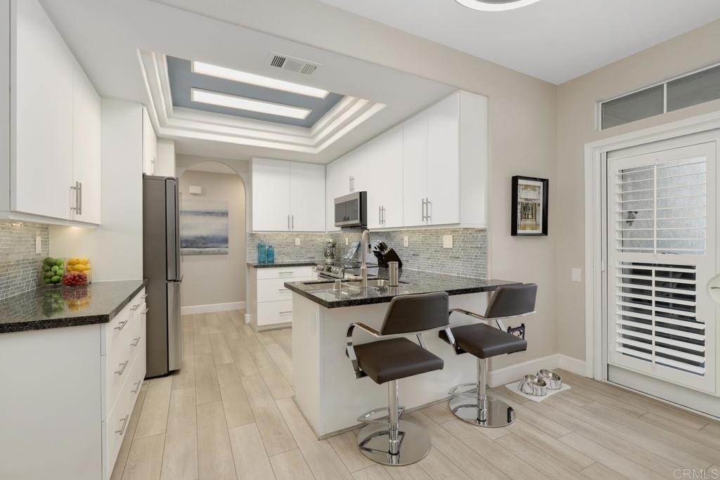 Welcome home to this highly upgraded 2 bedroom, 2 bathroom single story first floor condo in the gated 55+ community of Villa Trieste. This sought after floor plan is rarely available, it is the largest of the 2 bedroom models with soaring 9' ceilings, and the entire home has been renovated from top to bottom. Let’s start with the kitchen where we tend to spend so much time. Once everything was out, the owners started by putting in new high quality cabinetry with soft closing doors and drawers throughout. The generous cabinets were topped with custom selected Granite countertops and finished with a full glass tile backsplash. Dimmable, color programmable under cabinet lights were added and high quality Samsung stainless steel appliances were installed including a wine refrigerator. The original outdated overhead lighting was removed, both the kitchen and dining rooms ceilings were raised in a tray shape to make the rooms feel more open and spacious. Fresh water is supplied by the installed HALO water system and the home is lit by LED and Artika lighting. The living areas have been upgraded with durable LVP flooring, 6” baseboards, all new outlets and switches (all dimmable except primary closet), wood shutters throughout (including water proof shutters in the primary shower), retractable screen doors on the front door and patio along with custom paint throughout. Feel pampered in the bathrooms with executive height counters, comfort height Toto toilets, LED mirrored oversized medicine cabinets and custom shower with rainfall, waterfall, six jets, wand and bench seat in the primary bath. Additional upgrades include new AC with Nest thermostat (rarely used as the home enjoys ocean breezes), Google Nest smoke & CO detector, Schlage programmable entry lock, new full size LG stackable washer & dryer, retractable screens and French doors on both private patios along with an outdoor Kitchen Aid gas grill! The unit also includes a one car detached garage with keyless entry and a reserved parking spot. Residents LOVE Villa Trieste for many reasons including a super convenient location close to the freeway and just minutes away from Carlsbad and world class beaches and entertainment, a very reasonable HOA fee that includes a pool, jacuzzi, clubhouse, plentiful parking inside a safe, gated, age restricted community. This one of a kind home is sure to go quickly, interested parties are urged to take action before it is sold!