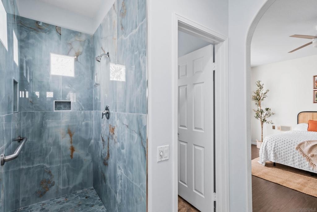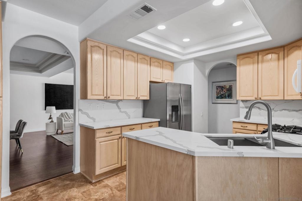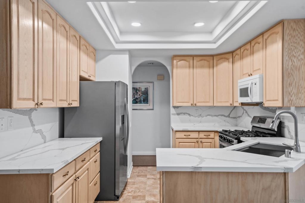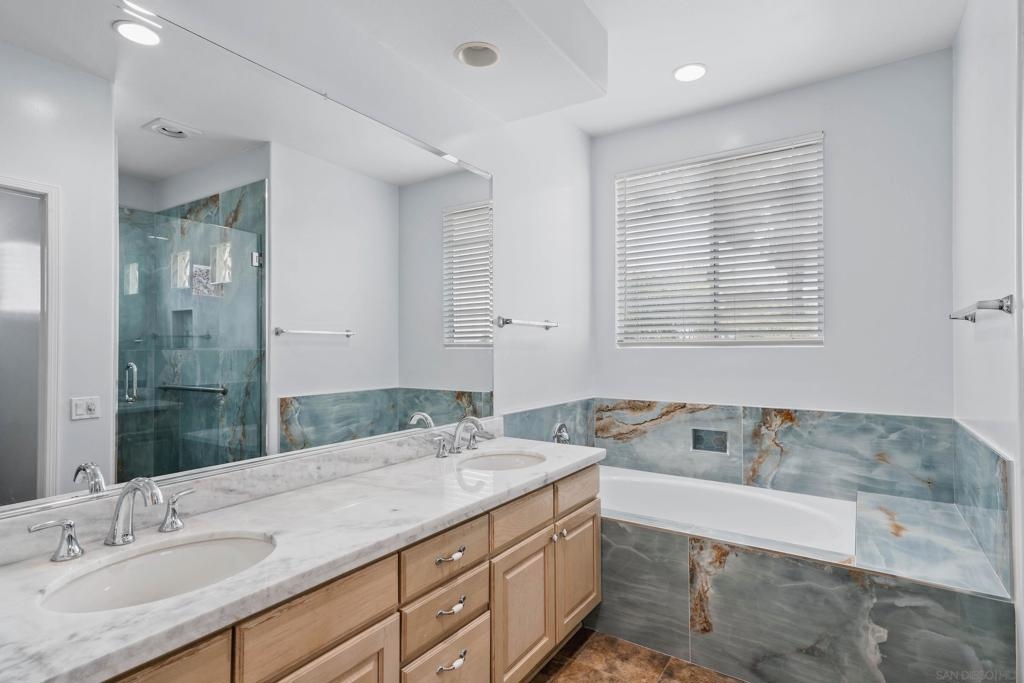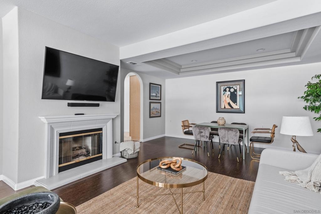Welcome to 3365 Genoa Way, a serene ground-floor retreat in a gated 55+ community in Oceanside. This single-story former model home blends Mediterranean charm with modern upgrades, featuring 1,334 sq/ft, 9 ft ceilings, and arched walkways. Enjoy two spacious bedrooms, two beautifully renovated bathrooms, and a stylish kitchen with premium quartz counters and Kenmore stainless steel appliances. Relax in the primary suite with a soaking tub, walk-in shower, dual vanities, and natural light. Cozy up by the fireplace, or unwind on either the private back patio-ideal for summer BBQing- or the front porch, perfect for gardening with your morning coffee. Community amenities include a heated pool, hot tub, bocce ball court, clubhouse with special events, a lounge, and gazebo. Additional perks: central A/C, gas heat, washer/dryer, detached garage just steps away, and a gated entry for added peace of mind. This is coastal living at its best-luxury, comfort, and convenience in one vibrant community package.