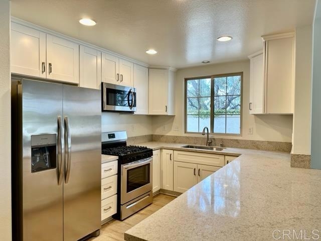 Welcome home to the Villas at Mission Point! This highly desirable END UNIT is on the eastern edge of the complex and features an all new kitchen with stainless steel appliances, white Shaker cabinets and composite stone countertops. Other upgrades will include new vinyl plank and carpet flooring, new paint and refurbished bathrooms. All bedrooms are upstairs with the laundry room, and the townhouse features a direct access two-car garage, guest parking, and ample street parking. The low fee HOA includes maintenance of the lush common area, a sports court, small playground and picnic seating areas. Super location close to all and just one mile to El Camino High School and half a mile to Mission San Luis Rey.