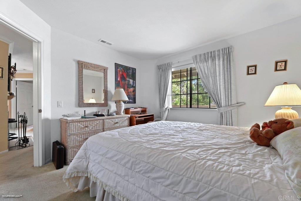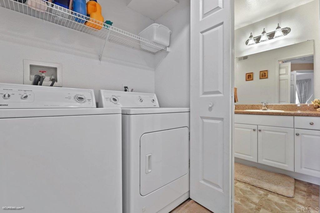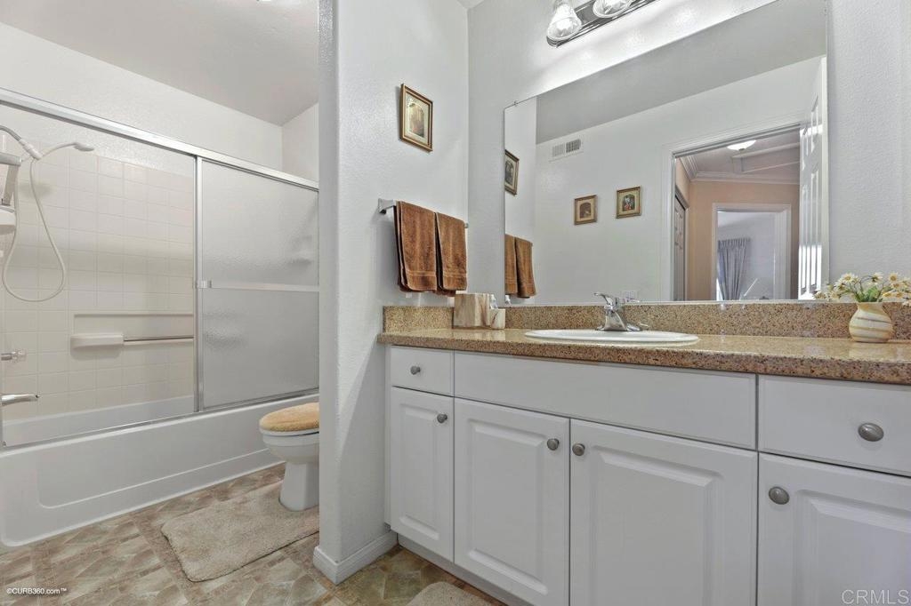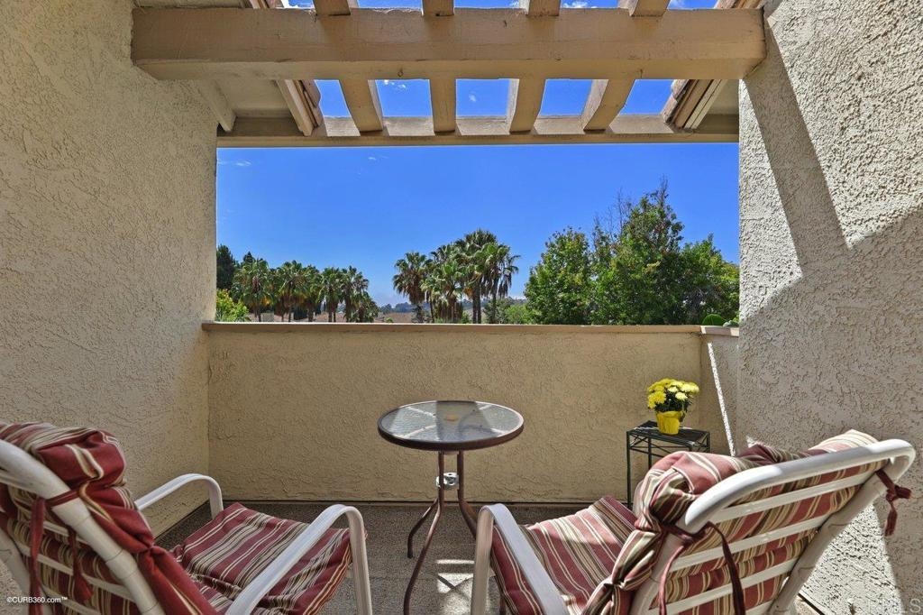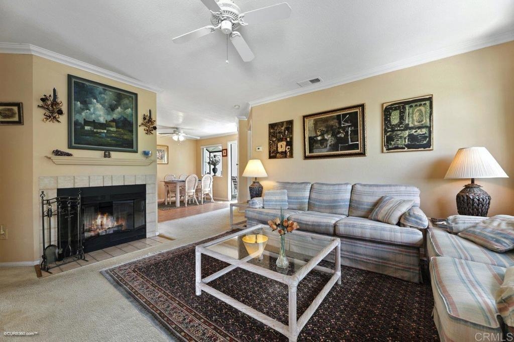 Kitchen features granite counters, wood cabinets & tile flooring. It opens to a dining room with tile flooring & ceiling fan. The carpeted living room has a fireplace & ceiling fan. Master bedroom has mirrored closet doors & ceiling fan. Both bathrooms have granite countertops & shower / tub combo. Laundry closet in unit. Balcony has a south facing view. 1 car garage & 1 parking space. Gated community has 2 pools, a clubhouse with a gym & tennis court.