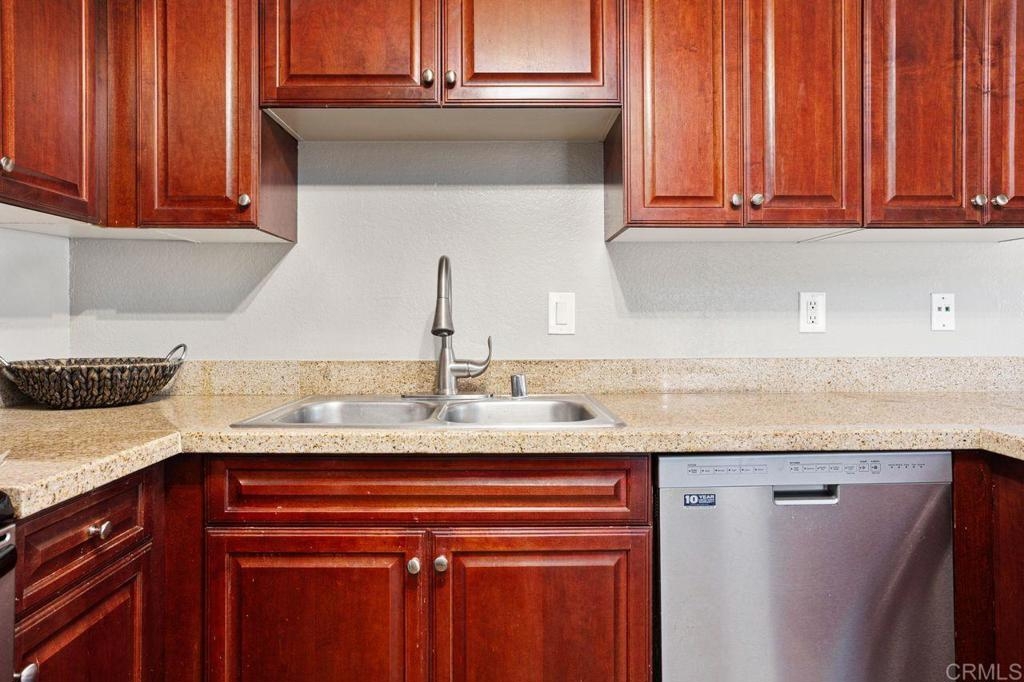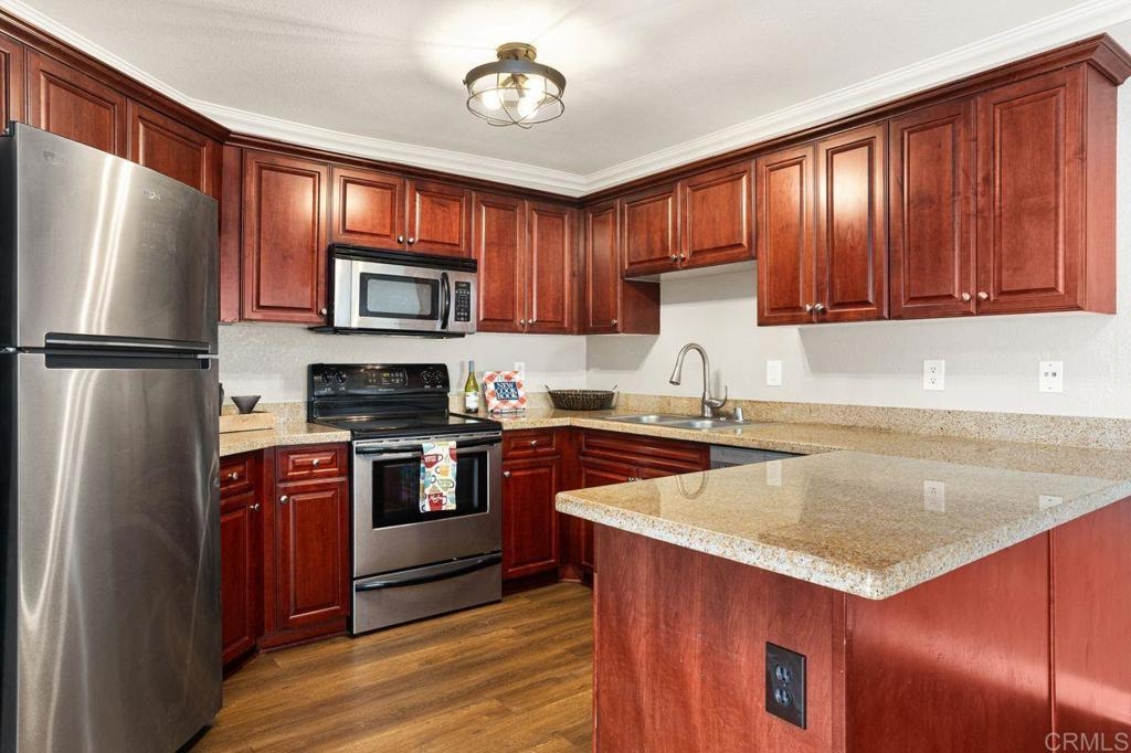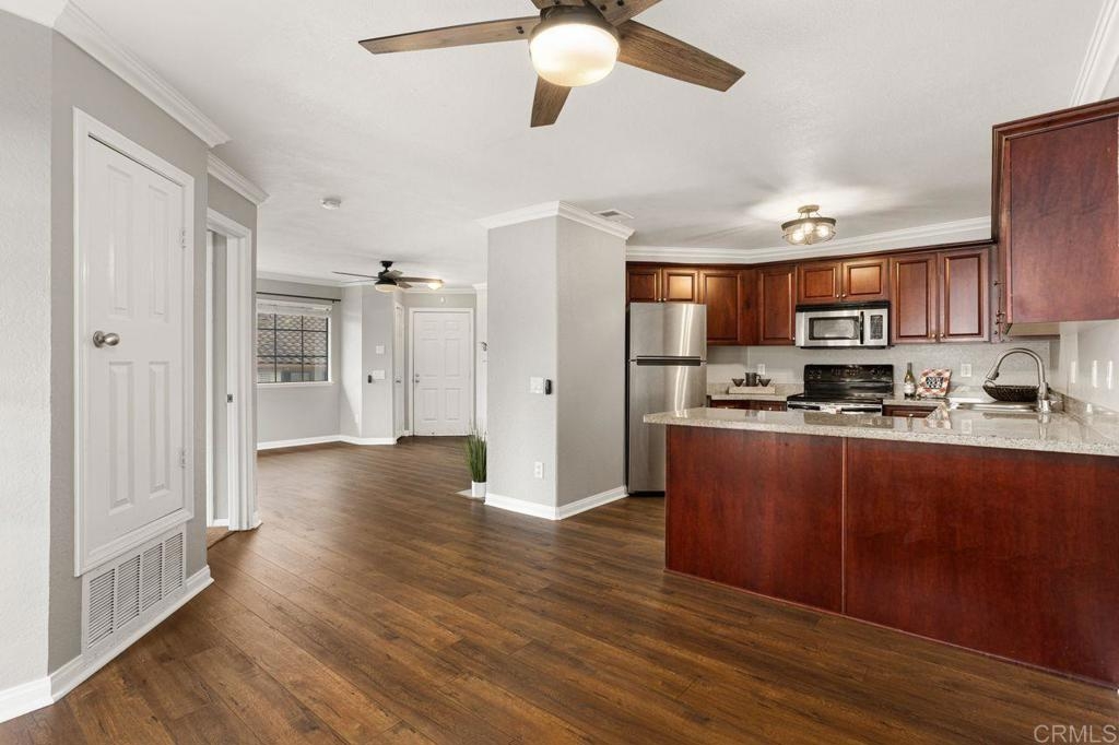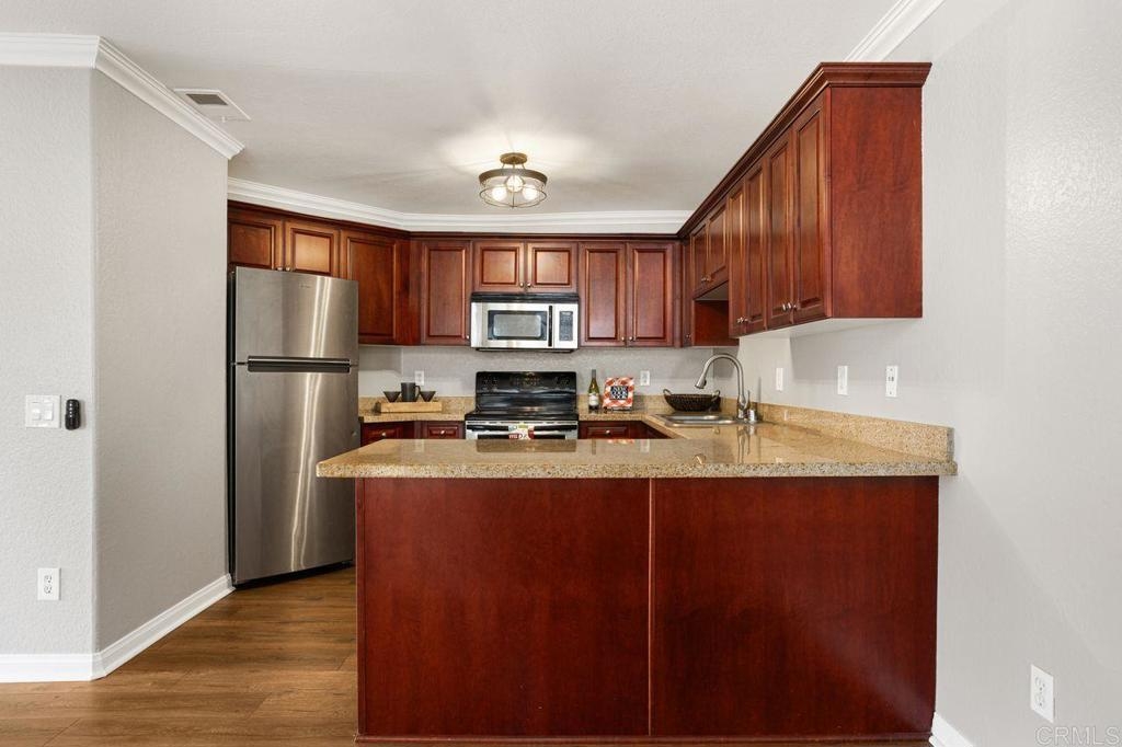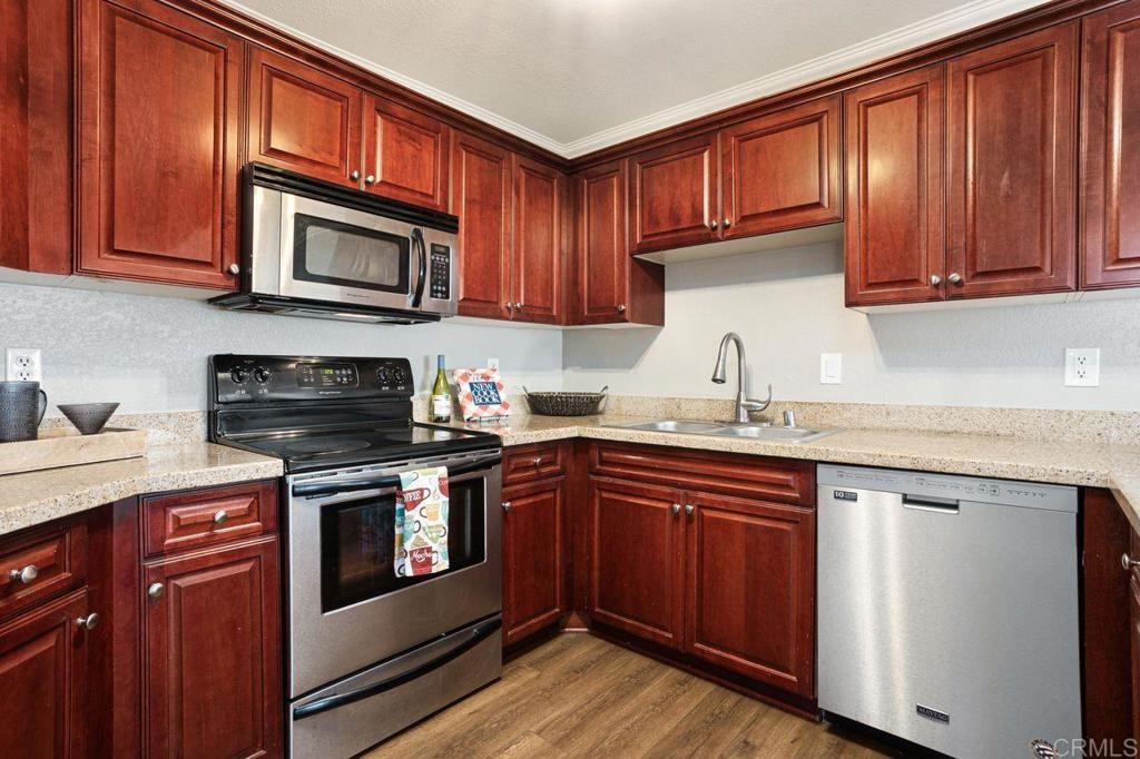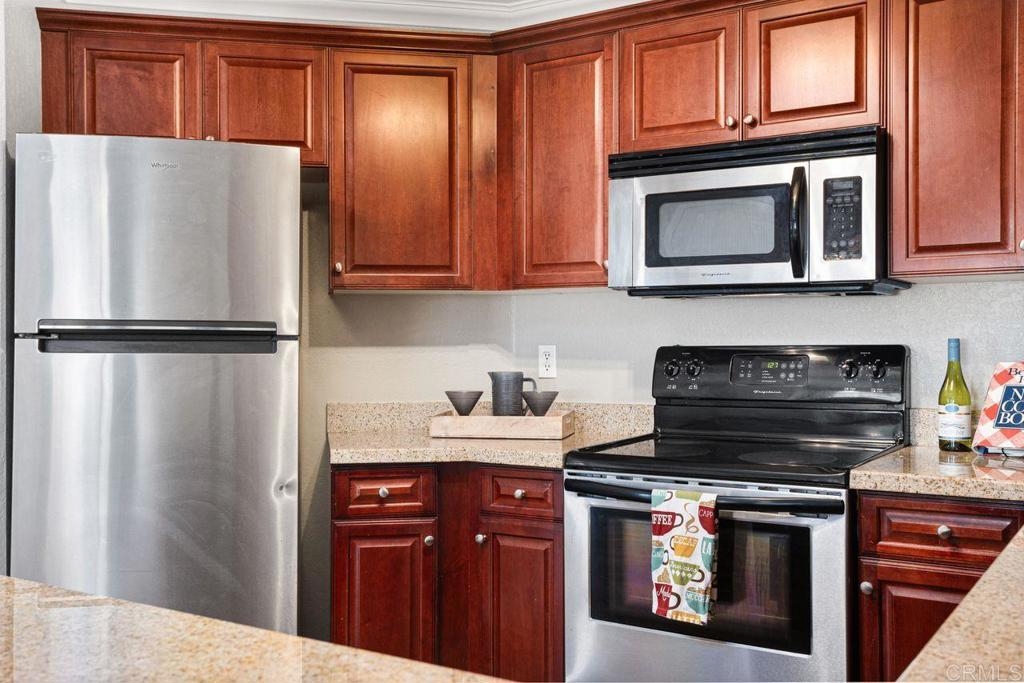 Welcome to Vista Way Village, a lovely gated community located approximately 4 miles from the ocean in beautiful Rancho Del Oro! This well-maintained 2nd story, end-unit boasts 2 bedrooms, 2 full bathrooms, and 1093 square feet of thoughtfully designed living space. The light and bright living room offers southwest facing views, a charming fireplace, laminate wood floors, and designer ceiling fan. Step into the heart of the home where the functional kitchen awaits, featuring granite counters, ample cabinet storage, and all the necessary appliances including microwave, dishwasher, electric range, and refrigerator. The dining area is adjacent to the kitchen and features a ceiling fan and lovely garden window overlooking the balcony. The bedrooms are situated on opposite sides of the condo offering privacy and tranquility. The primary bedroom has mirrored wardrobe doors, a ceiling fan, and en-suite bathroom with a single-sink vanity and combo tub/shower. The 2nd bedroom has a walk-in closet and is just steps from the large guest bathroom which includes an oversized vanity w/granite counters and a tub/shower combo. Additional highlights include neutral interior paint, crown molding, full-size washer and dryer, and a 1-car detached garage plus an assigned parking spot for added convenience. Community living reaches new heights with a wealth of amenities at your fingertips. Dive into relaxation with 2 swimming pools and a rejuvenating spa, stay active at the gym or tennis courts, and gather with neighbors at the clubhouse or playground. In addition to these fabulous amenities, the HOA fee covers water, trash and sewer. The home is located near the entrance to the community and close to the mailboxes and one of the community pools. Quick access to the 78 freeway via College or El Camino Real means shopping, hospitals, restaurants, golf and the beach are just minutes away. Be sure to schedule your showing today and make Vista Way Village your new home sweet home!
