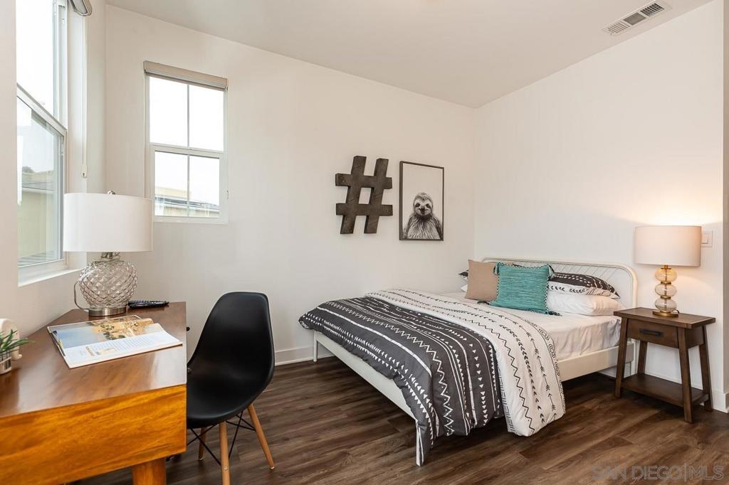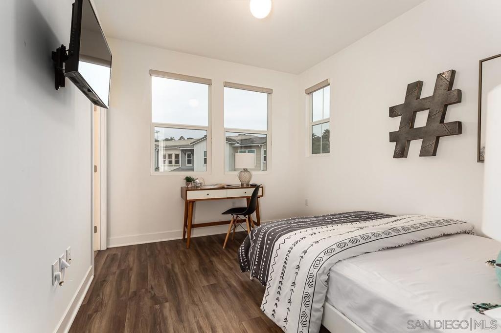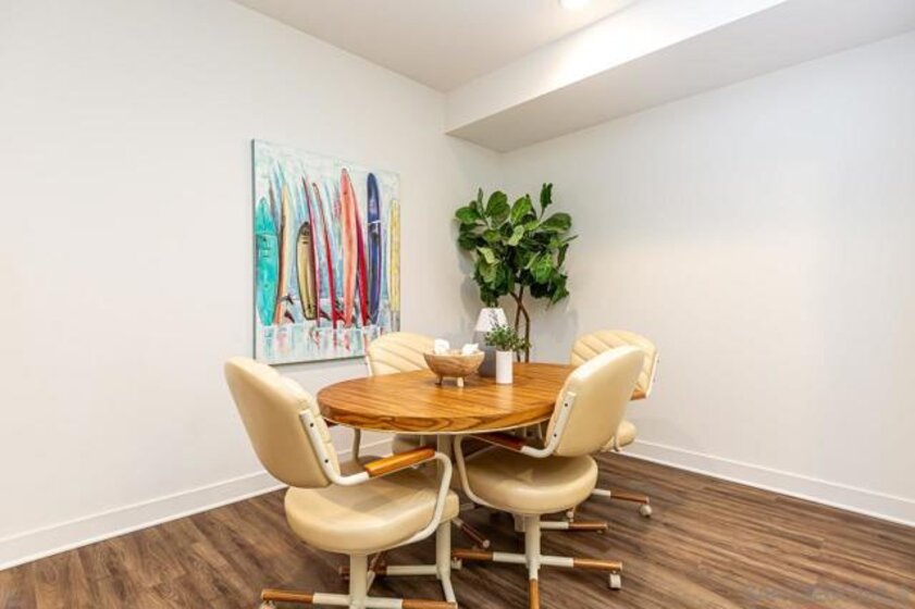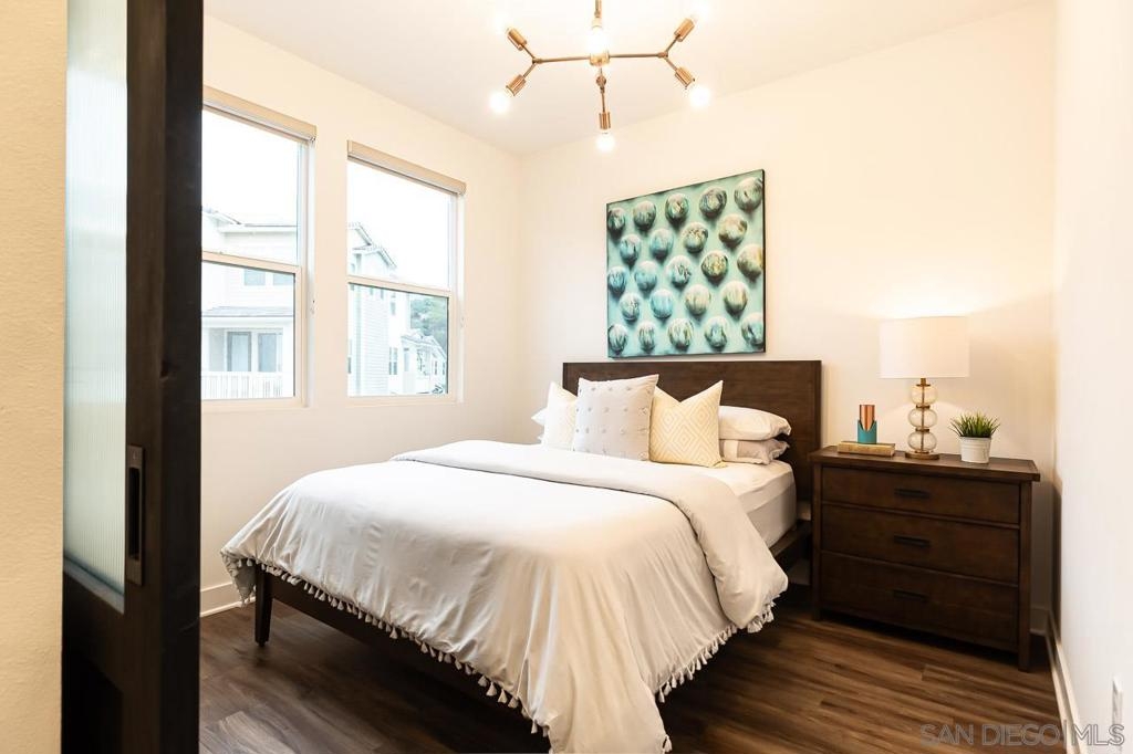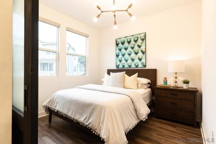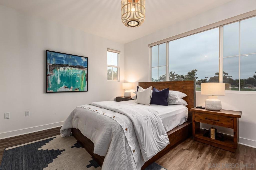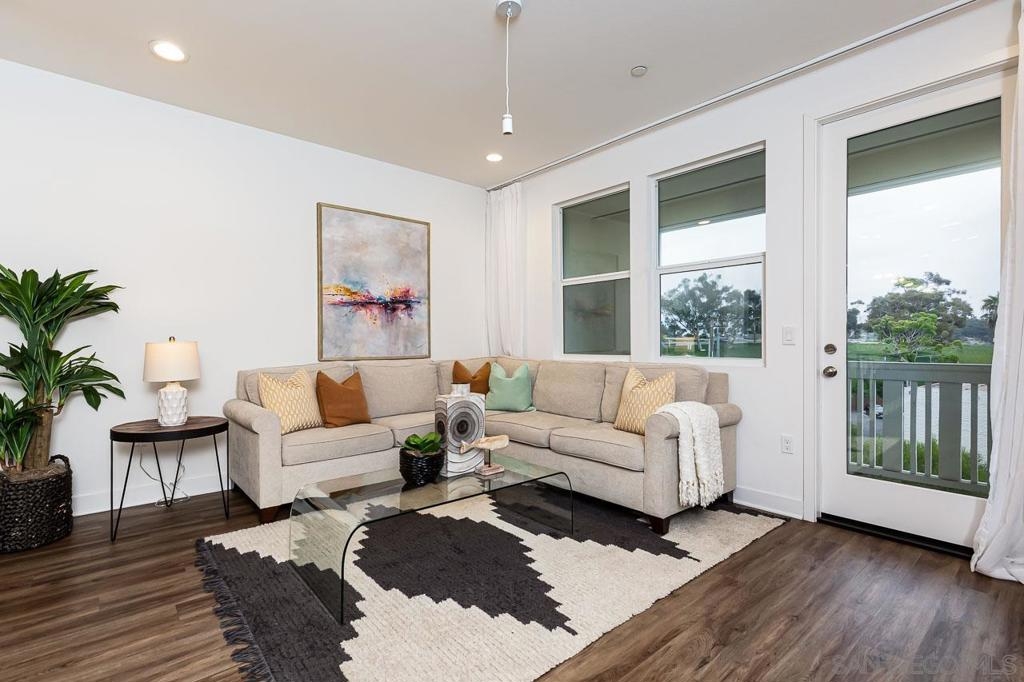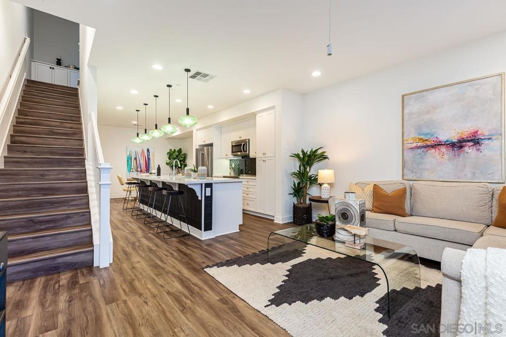 Welcome to this beach-close, west-of-the-5 townhouse in The Tides Complex. This modern residence offers a well-designed 3-bedroom, 2.5-bath layout with approximately 1,775 square feet of comfortable living space. Eco-conscious features include owned solar panels, an ECO water heater, and electric vehicle hookups in the private two-car garage. Inside, elevated finishes include wood and tile flooring, high ceilings, luxury appliances, and an open kitchen that flows seamlessly into the family room. Upgrades throughout the townhome include owned solar, an ECO water heater, Nest-controlled AC, electric vehicle hookups, and a striking 13-foot quartz island. Luxury vinyl flooring runs throughout, complemented by custom inlay tile on the stairs, a designer kitchen backsplash, curated lighting, and a custom barn door in the third bedroom. Thoughtful storage is built in, including custom closets, overhead garage storage, and an oversized tandem garage with workspace. The kitchen is anchored by a Bertazzoni range and upgraded stainless steel appliances. Built in 2019, the desirable Tides Complex features gated entry, a clubhouse, and a resident pool. Off-street parking for two vehicles and an upper-level laundry area add everyday convenience.