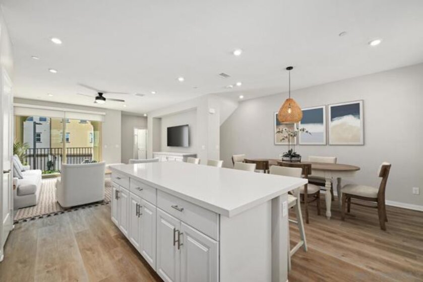 This beautifully designed tri-level townhome in Melrose Heights offers owned solar, guest parking directly in front of the unit, and an attached two-car garage. The open floor plan showcases durable flooring throughout the main living areas, a light-filled living room with balcony access, and a beautifully appointed kitchen featuring quartz countertops, a center island, crisp white cabinetry, stainless steel appliances, and recessed lighting. All bedrooms are thoughtfully located upstairs, including a spacious primary suite complete with an en-suite bathroom and walk-in closet. A full-size Samsung washer and dryer convey with the property for added convenience. Enjoy resort-style community amenities including a pool, spa, BBQ areas, tot lot, and recreation spaces—perfect for both everyday living and entertaining.