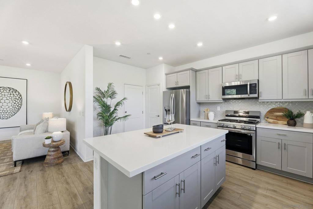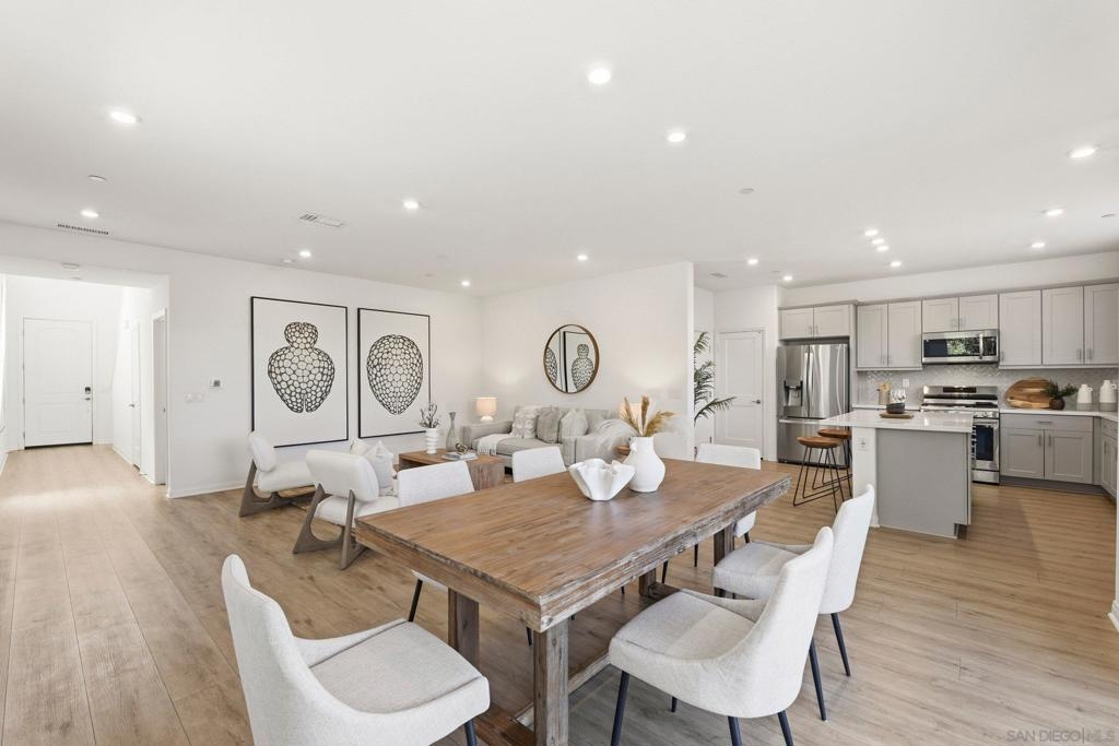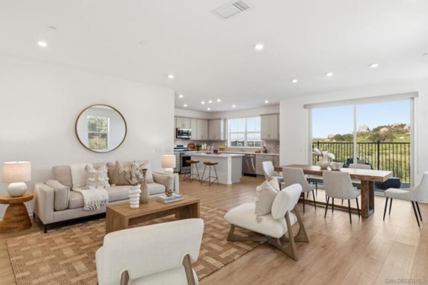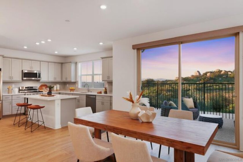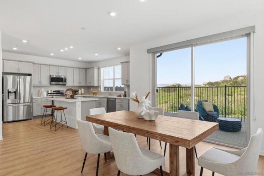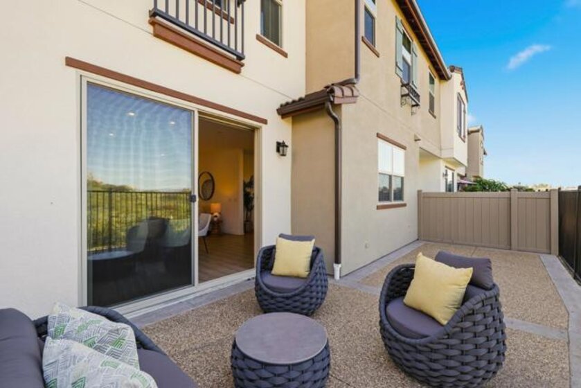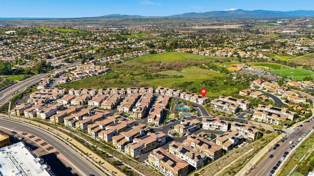 Move-in ready townhome with breathtaking canyon and mountain views, located in the beautiful Oceanside community of Melrose Heights. Built in 2022, this prime-location, two-story luxury townhome features OWNED Solar and a thoughtfully designed open-concept layout where the kitchen, living, and dining areas all capture stunning views. LVP flooring throughout. A convenient first-floor powder room adds functionality for guests. The chef’s kitchen is a standout, showcasing an oversized island, quartz countertops, LED recessed lighting, expansive counter and cabinet space, a large pantry, and top-of-the-line Samsung and LG stainless steel appliances. Situated on a premier lot with no neighbors in front, behind, or on one side, the home offers exceptional privacy along with a spacious, fenced in backyard with custom designed concrete patio. Second floor showcases a luxurious primary suite featuring white quartz countertops, walk in shower, soaking tub, and an oversized walk in closet. Three additional bedrooms, a full bathroom with dual-sink vanity, and a second-floor laundry room with built-in cabinetry. Smart energy efficient home with paid off solar is equipped with robust EERO wifi boosters and smart thermostats. Additional upgrades include Premium Norman sunshades and custom tile in all bathrooms and kitchen. Attached two-car garage with dual single-car doors. Melrose Heights offers resort-style amenities including a pool and spa, playgrounds, and excellent walkability. Conveniently located near shopping, dining, and Vista Sports Park—this exceptional home is a must-see