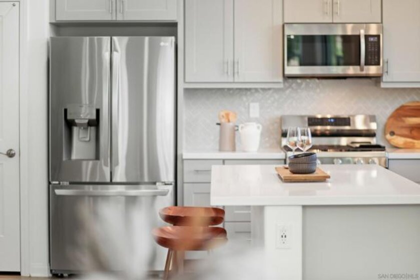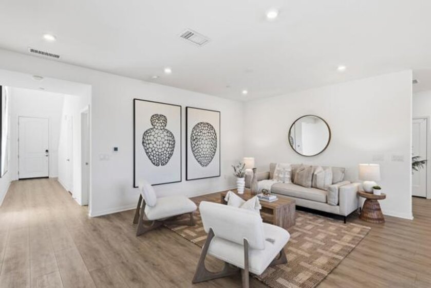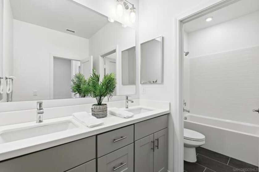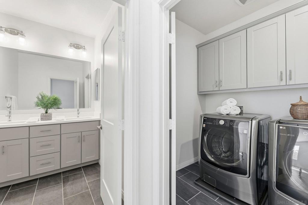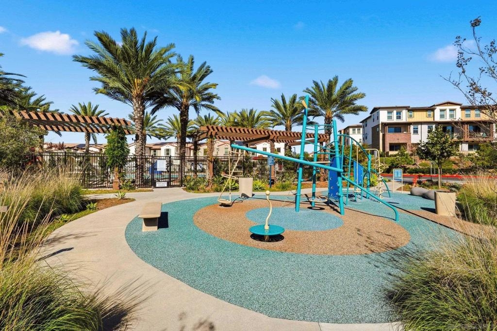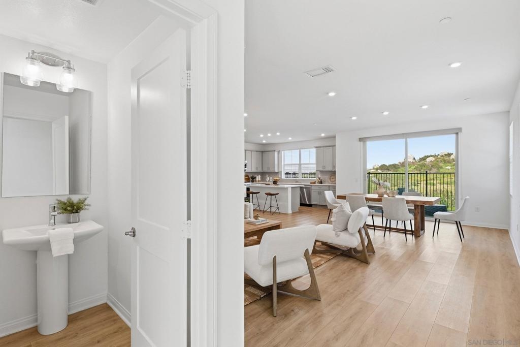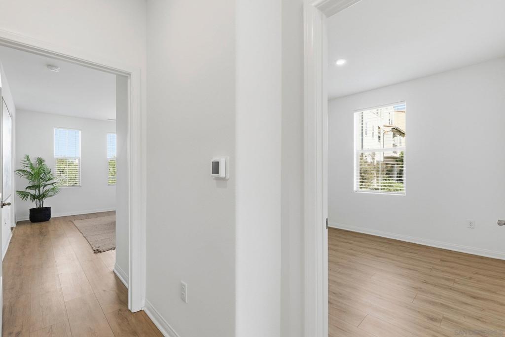 Move-in ready townhome with breathtaking canyon and mountain views, located in the beautiful Oceanside community of Melrose Heights. Built in 2022, this prime-location, two-story luxury townhome features OWNED Solar and a thoughtfully designed open-concept layout where the kitchen, living, and dining areas all capture stunning views. LVP flooring throughout. A convenient first-floor powder room adds functionality for guests. The chef’s kitchen is a standout, showcasing an oversized island, quartz countertops, LED recessed lighting, expansive counter and cabinet space, a large pantry, and top-of-the-line Samsung and LG stainless steel appliances. Situated on a premier lot with no neighbors in front, behind, or on one side, the home offers exceptional privacy along with a spacious, fenced in backyard with custom designed concrete patio. Second floor showcases a luxurious primary suite featuring white quartz countertops, walk in shower, soaking tub, and an oversized walk in closet. Three additional bedrooms, a full bathroom with dual-sink vanity, and a second-floor laundry room with built-in cabinetry. Smart energy efficient home with paid off solar is equipped with robust EERO wifi boosters and smart thermostats. Additional upgrades include Premium Norman sunshades and custom tile in all bathrooms and kitchen. Attached two-car garage with dual single-car doors. Melrose Heights offers resort-style amenities including a pool and spa, playgrounds, and excellent walkability. Conveniently located near shopping, dining, and Vista Sports Park—this exceptional home is a must-see