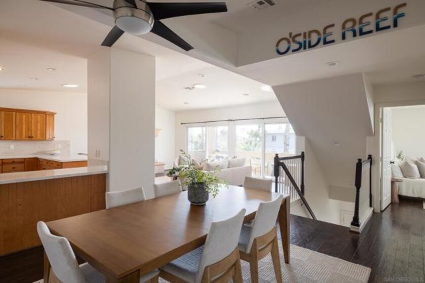 Live the South Oceanside lifestyle the way it’s meant to be — close to the beach, your favorite coffee shop, and the laid-back energy that makes this neighborhood so magnetic. This spacious 2,716 sq ft home features 4 bedrooms and 3.5 baths and lives like a detached residence. What truly sets it apart is the flexibility: with two separate entrances and laundry on both levels, the upstairs and downstairs can function as two distinct units if desired. Whether you’re thinking multigenerational living, guest quarters, or income potential, the layout gives you options. Upstairs is the heart of the home. The open-concept design connects the living room, dining area, and kitchen into one bright, welcoming space that feels open yet comfortable. The home has been freshly painted throughout, creating a clean, cohesive look. Natural light pours in thanks to thoughtfully placed light tubes, filling the upstairs living area with a bright, airy feel throughout the day. The kitchen has been updated with brand-new countertops and a modern backsplash, complemented by stainless steel appliances, a walk-in pantry, and generous prep space. The flow to the dining area and outdoor patio makes entertaining effortless and everyday living feel easy. The upstairs primary suite offers plantation shutters, dual vanities, a spacious shower, and a walk-in closet. A dedicated laundry room and powder bath complete this level. Downstairs adds even more versatility, featuring two en-suite bedrooms plus an additional large bedroom with dual closets and a statement fireplace. With its own entrance and laundry area, this level can comfortably operate as a separate living space. Additional highlights include recessed lighting, engineered hardwood floors, new carpet, plantation shutters, and an oversized two-car garage with ample storage. And don’t forget the rooftop deck — your private perch to soak in ocean breezes and sunset skies. From checking the waves at Cassidy, grabbing coffee at Revolution Roasters, picking up surf wax at Surfride, or grabbing a burger at Tanner’s Prime Burgers — it’s all just steps from your front door. Flexible. Coastal. Full of possibility. South Oceanside living at its best.