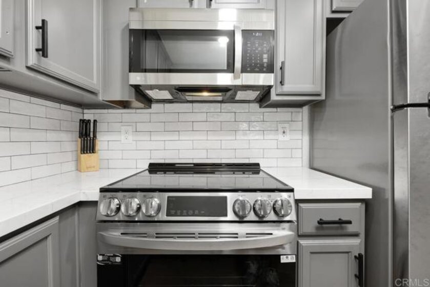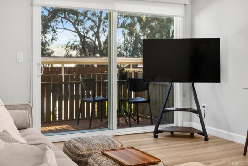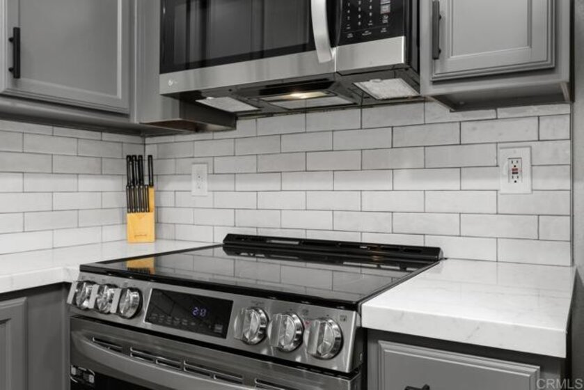 Move-in Ready! Gorgeous and remodeled 2-bedroom, 1.25-bath condo. From the moment you arrive, the smart front door makes an impression, with privacy glass that shifts from frosted to clear at the touch of a button and keyless fingerprint entry for effortless coming and going. Inside, wide-plank LVP flooring flows throughout, tying together a soft, neutral paint palette, smooth ceilings, and recessed lighting with dimmer switches. The kitchen is thoughtfully updated with quartz countertops, refinished cabinetry and hardware, a deep single-basin sink with a tall pull-down faucet, stainless steel appliances, and a daily dining bar that opens to the adjacent dining area. The beautifully updated bathroom features a floating vanity with a quartz countertop, designer mirror and lighting, a tiled shower surround with a soap niche, a sleek semi-frameless shower door, and upgraded fixtures. Spacious primary bedroom has its own private vanity area, adding the convenience of a dedicated dressing space, including a large linen cabinet for extra storage. The primary bedroom also offers a large walk-in closet. The secondary bedroom completes the floor plan. Additional features include pocket doors throughout that have been added to maximize space and functionality, new dual-pane windows plus an 8-foot slider, and new wall heaters. The large private patio extends your living space outdoors and includes a convenient walk-in storage closet. Gated community offers a pool, spa, barbecue area, and beautifully landscaped green spaces with mature trees throughout. Conveniently located near shopping, restaurants, freeways and the beach.