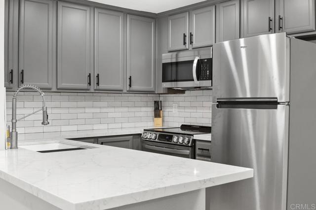 Inspiration meets design in this gorgeous, remodeled two-bedroom, one-bath condo. From the moment you arrive, the smart front door makes an impression, with privacy glass that shifts from frosted to clear at the touch of a button and keyless fingerprint entry for effortless coming and going. Inside, wide-plank LVP flooring flows throughout, tying together a soft, neutral paint palette, smooth ceilings, and recessed lighting with dimmer switches. The kitchen is fresh and thoughtfully updated with quartz countertops, refinished cabinetry and hardware, a deep single-basin sink with tall pull-down faucet, stainless steel appliances, and a daily dining bar that opens to the adjacent dining area. The beautifully updated bathroom features a floating vanity with a quartz countertop, designer mirror and lighting, a tiled shower surround with a soap niche, a sleek semi-frameless shower door, and upgraded fixtures. Just off the bathroom, a matching vanity area for the spacious primary bedroom adds the convenience of a dedicated dressing space, and this area also includes a large linen cabinet for extra storage. The primary bedroom also offers a large walk-in closet with a custom closet system, while the secondary bedroom is generously sized and ideal for guests, a home office, or flex space. Pocket doors have been added throughout to maximize space and functionality, and new dual-pane windows plus an 8-foot slider are designed for comfort and energy efficiency. The large private patio extends your living space outdoors and includes a convenient walk-in storage closet. All of this is set within a gated community that offers a pool, spa, barbecue area, and beautifully landscaped green spaces with mature trees throughout. The location also provides a quick drive to the beach, easy freeway access, and shopping and restaurants typically within 5 to 10 minutes. With so many thoughtful upgrades already in place, this is truly a move-in-ready home you can start enjoying from day one.