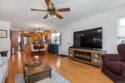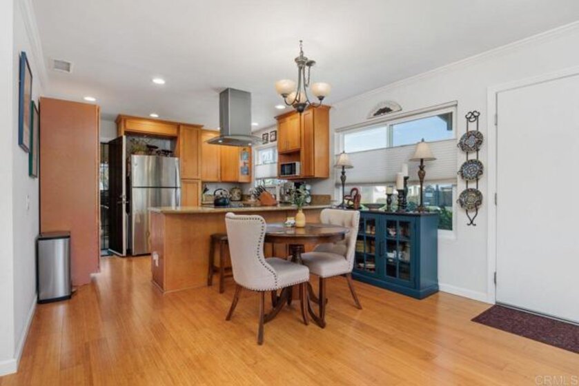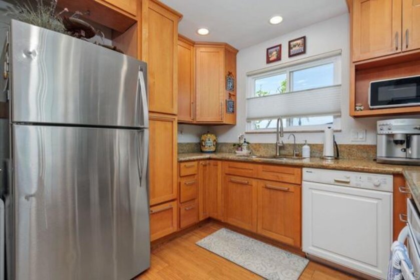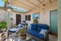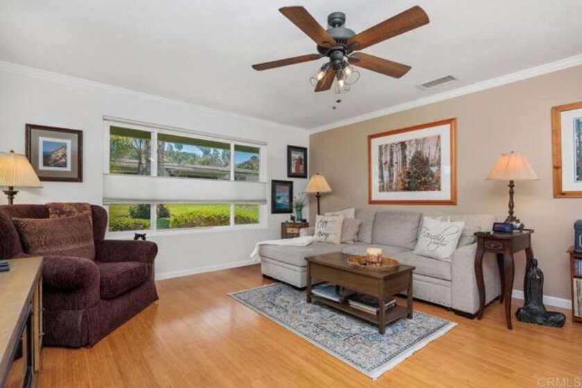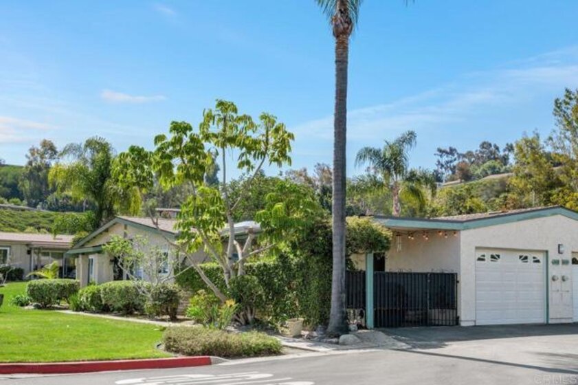This end unit exudes privacy and serenity. Situated on an expansive open space. Take the walkway to front door entering living room/dining room/kitchen creating an open floorplan concept. Previously remodeled kitchen featuring quality, abundant wooden cabinetry and appliances. The use of solar tubes (four) strategically placed adds to the light, sunny feeling of this home. Windows have been upgraded as well as custom fans in each living space. Note custom wooden interior doors plus wood flooring throughout w custom, upgraded baseboards. Retreat to outdoor living when entering serenity of patio designed for privacy. Skylight here strategically designed brings natural light into primary bedroom as well. Window coverings on most windows are customized to open at top or bottom which creates light in but keeps privacy. And there's more! New roof, AC updated baths. Lots of guest parking close at hand; one car garage with laundry. Enjoy community pool close at hand but far enough away as well!