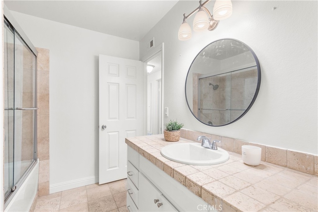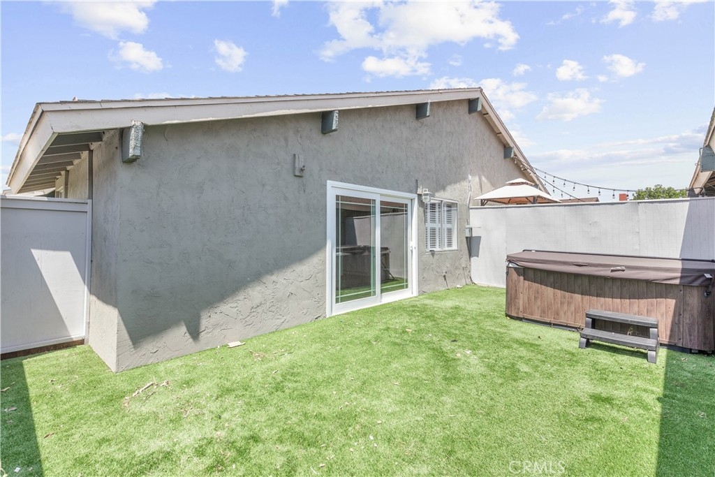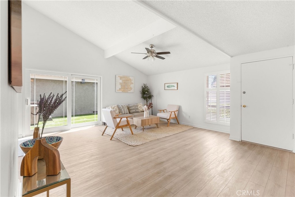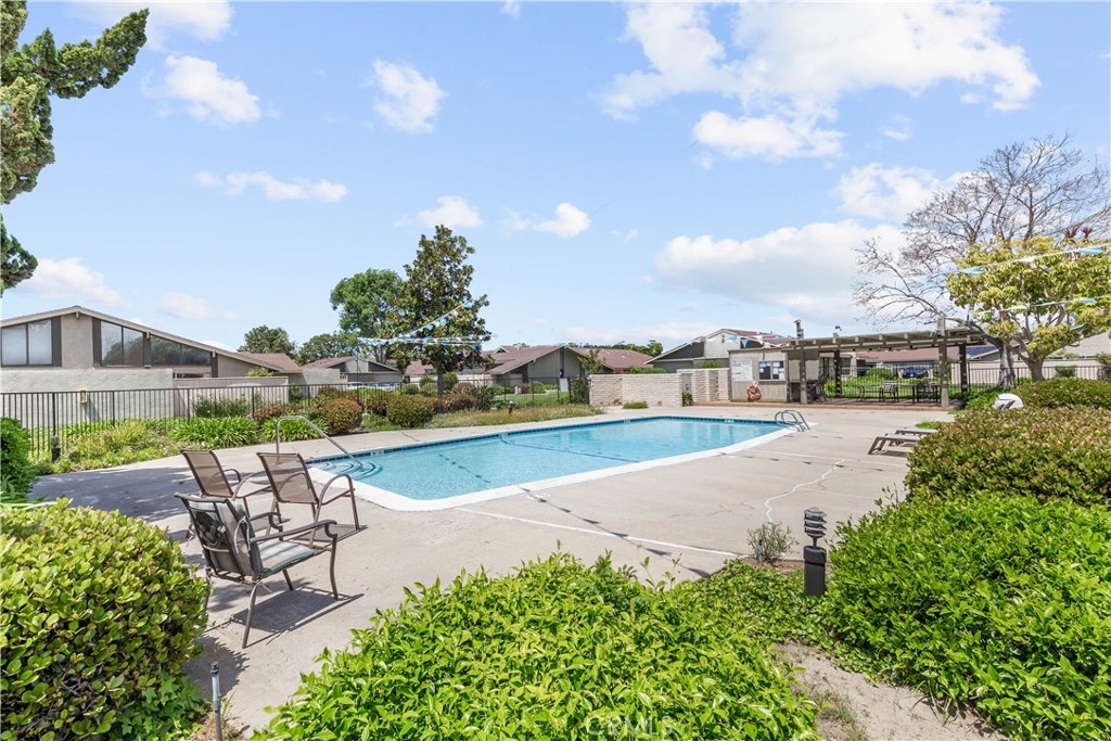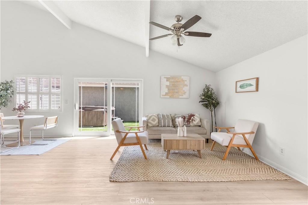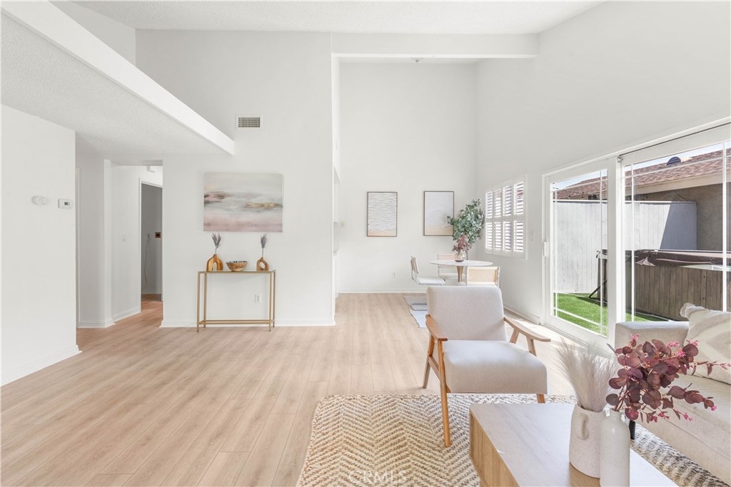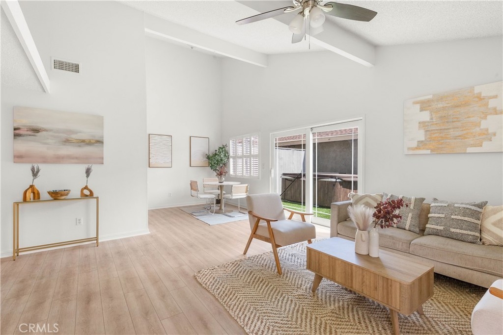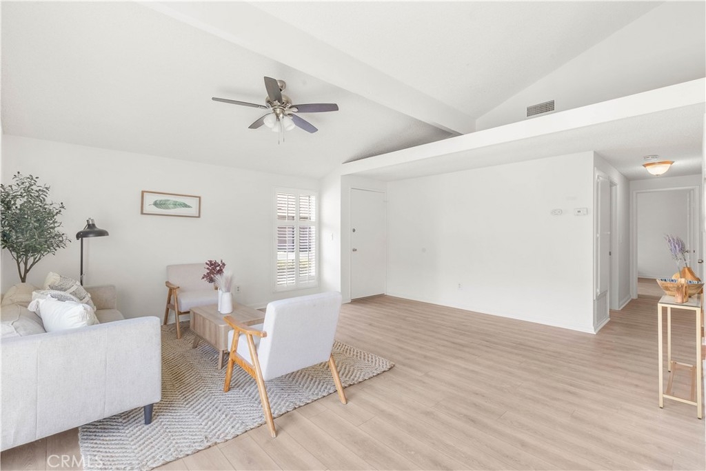 Welcome to this charming two-bedroom home nestled in the sought-after Orchard Lane community. Recently updated, this residence boasts luxurious vinyl plank flooring and freshly painted interiors. Notable features include plantation shutters, central air conditioning, and an upgraded bathroom. The generous layout encompasses living and dining areas, along with a dedicated laundry room. The kitchen has been renovated and includes a refrigerator. Cathedral ceilings in the main living area enhance the feeling of spaciousness. Parking convenience is provided by a one-car garage, while outdoor relaxation awaits on the large private patio. Residents have access to community pools and spas in a Mello-Roos-free environment. The meticulously kept grounds of Orchard Lane offer a park-like ambiance, with additional parking available within the complex
