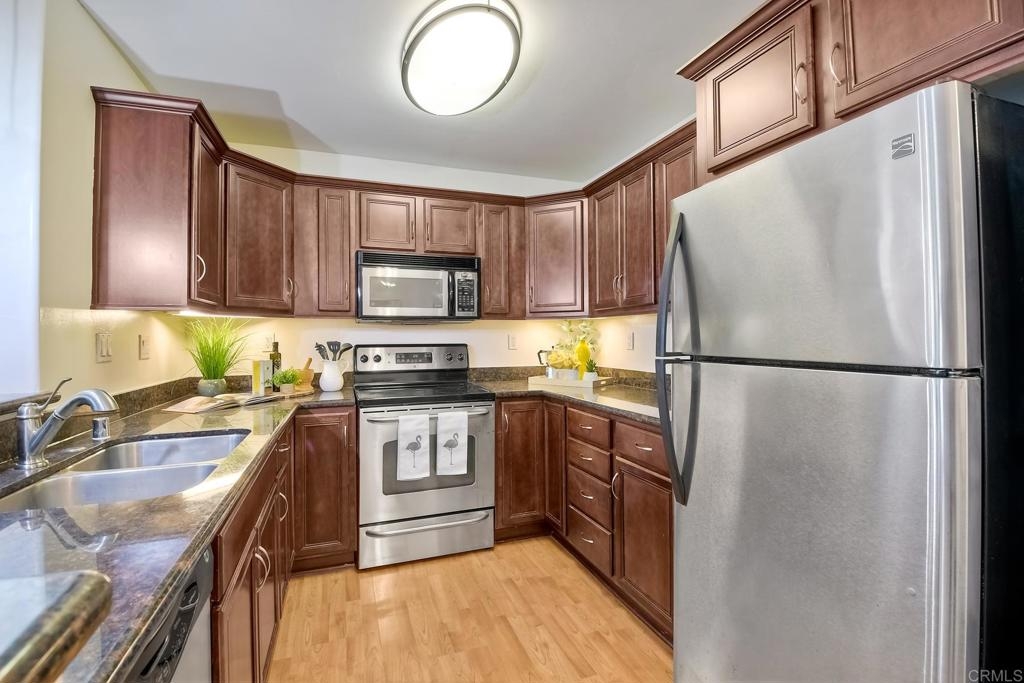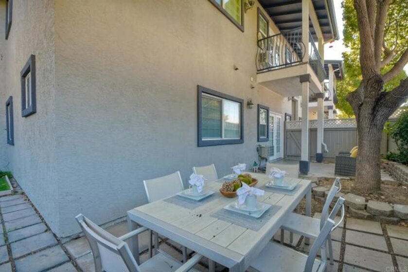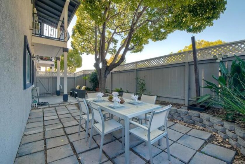 1st floor condo in Las Brisas with large private outdoor space, possibly the largest in the community so great for a dog. French doors open directly to your private yard. Home is freshly painted! Just 2 miles to Oceanside Beaches @ lifeguard Tower 9. Stacked laundry closet in unit and nicely upgraded kitchen. Walk-in closets in both bedrooms. Detached garage is located near unit, and you also get 1 reserved parking spot. HOA fees include use of pool/spa, tennis court, sport court as well as water, sewer & trash. Quick access to all downtown Oceanside has to offer; walk the Oceanside Pier and Strand Beach, loads of fine dining restaurants, and beach access end of the San Luis Rey River Trail.