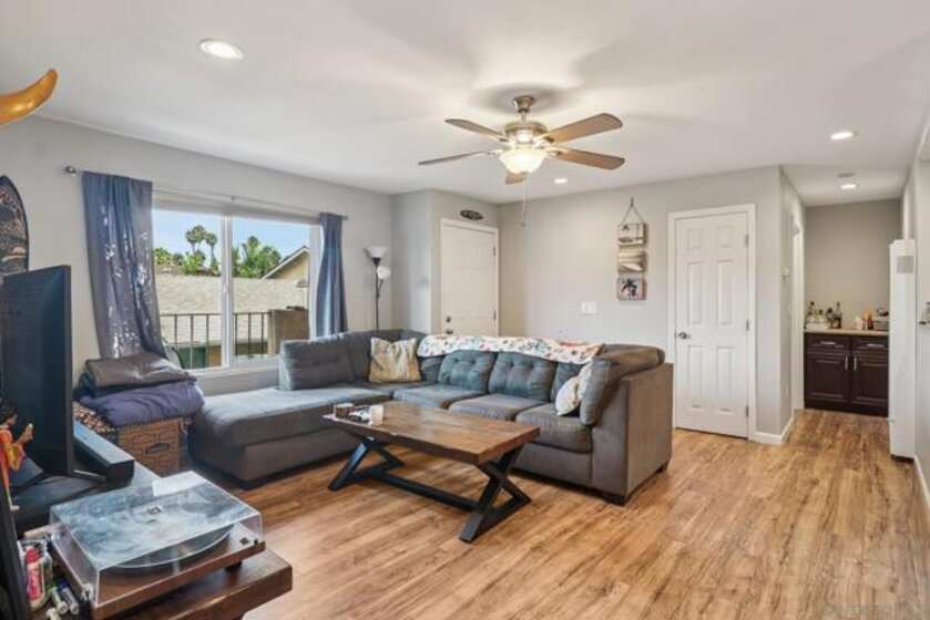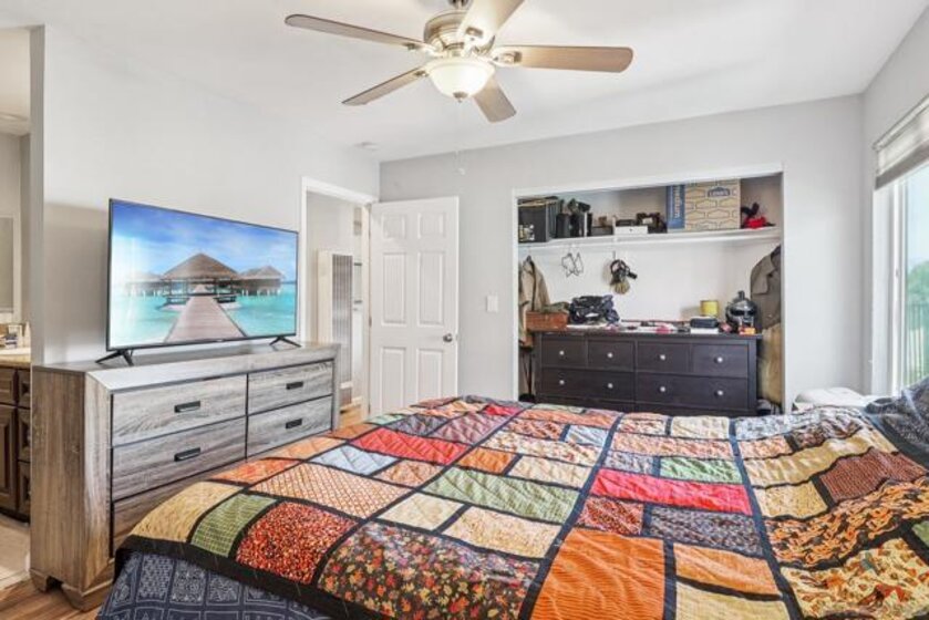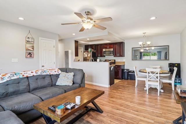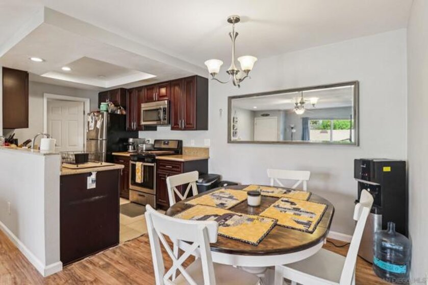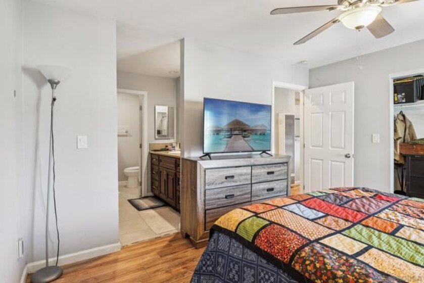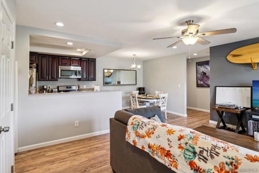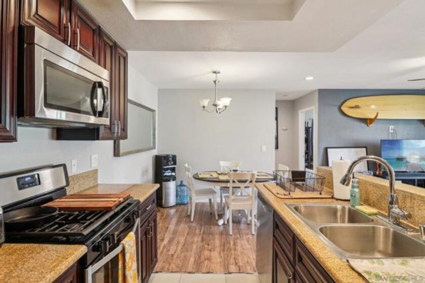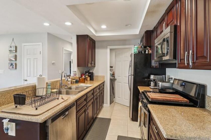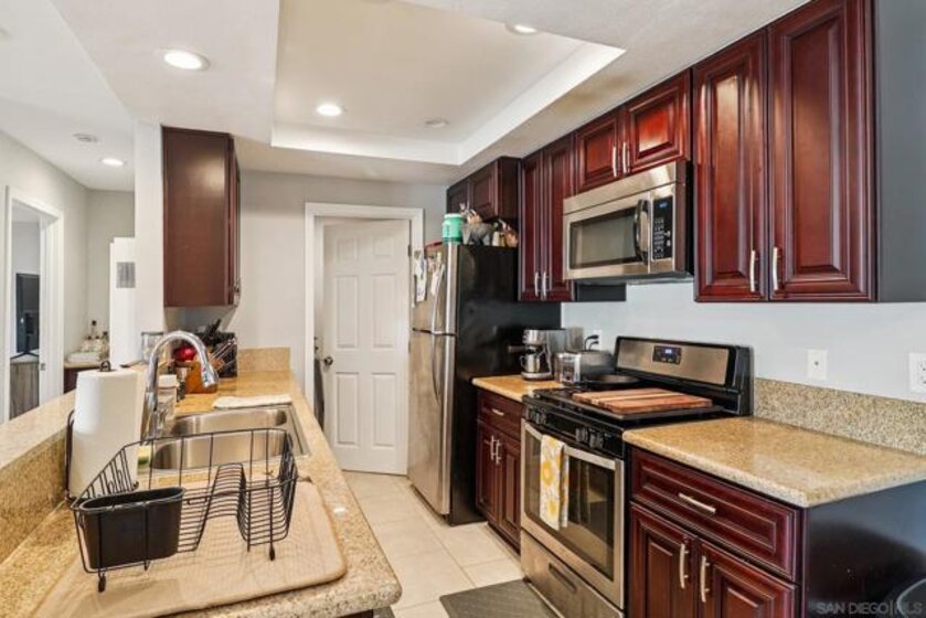 Very large & gorgeous updated 2BR/2BA condo with spacious open floor plan. Top floor end unit provides security and privacy. Beautiful kitchen features granite counters, cherry-finish cabinets, stainless steel appliances, recessed lighting & tile floors. Large primary suite w/ private bath + walk-in closet; 2nd bedroom also offers a walk-in closet. Light & bright interior with sizable hall bath. Full-size washer/dryer in a private laundry room—no shared laundry! Includes 1-car garage and assigned space. Move-in ready. VA approved.