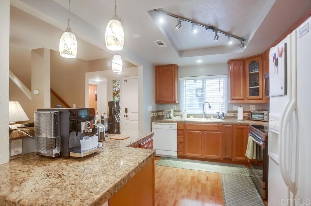 Welcome to this beautifully remodeled 3-bedroom, 2.5-bathroom townhome, perfectly situated in a tranquil neighborhood. Step inside to discover an inviting space featuring upgraded vinyl windows and a fully remodeled kitchen that seamlessly opens to the living area. The kitchen boasts modern appliances, elegant granite countertops, and stylish flooring, creating a truly spacious and welcoming environment. Bright living room with vaulted ceiling and ceiling fans throughout the home along with central air. The expansive primary bedroom is a true retreat, offering abundant closet space and soaring vaulted ceilings. Each bathroom has been thoughtfully remodeled, ensuring comfort and modern convenience for the whole family. Enjoy the outdoors in your private, nicely sized, fully paved patio area perfect for relaxation and gatherings, landscaping for reduced water use and zero scape. The home also includes a two-car garage with lots of storage and a quiet roll-up door. With leased solar panels, you can appreciate the benefits of energy efficiency and lower utility bills; run the A/C as much as you’d like! As part of a friendly community, you’ll have access to a refreshing pool and spa. Plus, this home is ideally located near award-winning schools, making it a perfect choice for families. Don’t miss your chance to own this prestigious home. Come take a look before it’s gone!