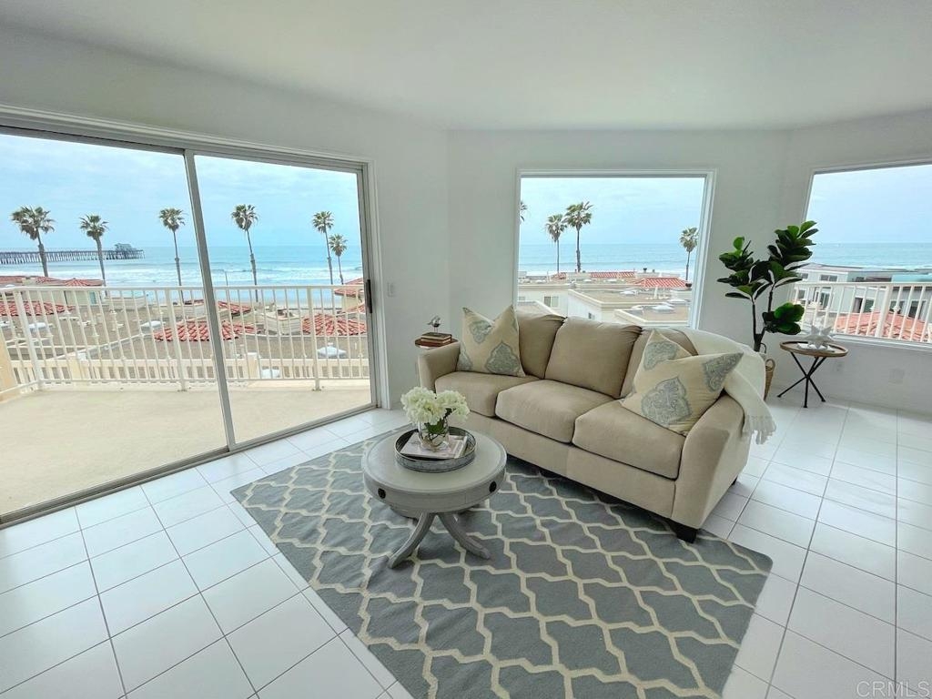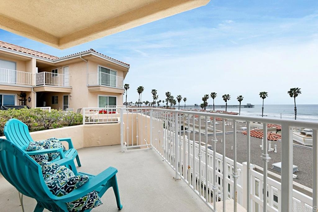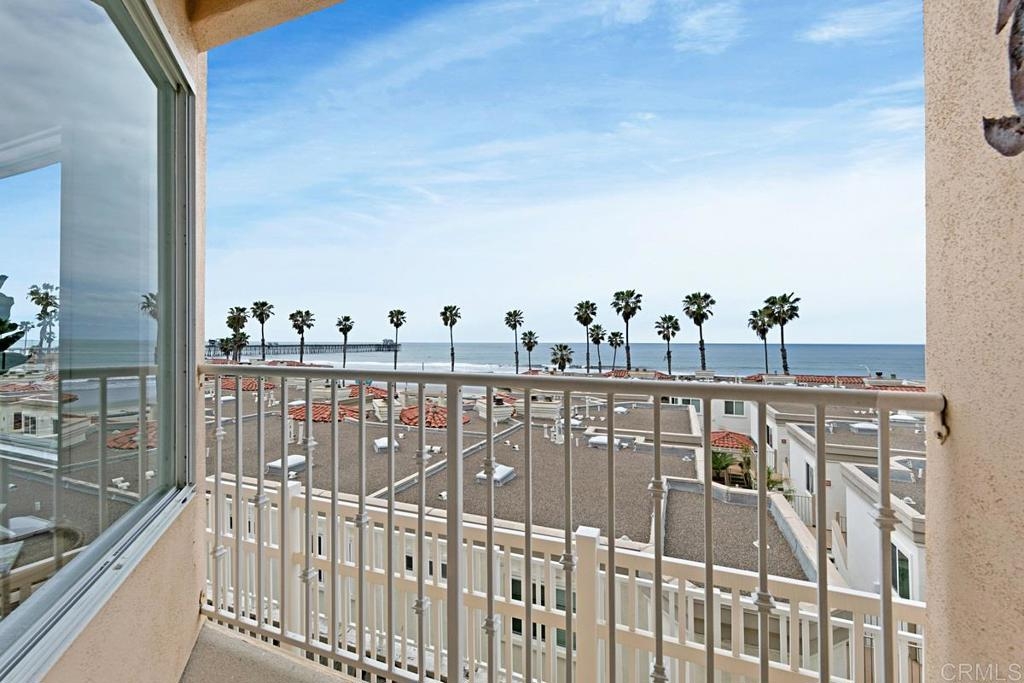 Breathtaking 180 degree white water ocean views and the iconic Oceanside pier. Just steps to the surf and sand; you'll feel like you are on vacation. This condo is flanked with a huge slider & large windows to maximize the stunning ocean view as well as two private balconies to soak up the sun's rays & ocean breezes. 2 generous size bedrooms, 2 full bathrooms, interior laundry, tile floors throughout main living spaces for easy clean up for sandy feet, plus brand new paint throughout & new carpet. Well maintained gated community with convenient BBQ areas, gated underground parking with 2 spots, storage area & bike room. Great opportunity to call the beach your home in the growing Oceanside community with the strand for daily walks & activity, nearby restaurants, coffee shops, wine bars & the well renowned pier right within view from your living room. This is only one of 15 units in the complex so they don’t come available often. It's simply the perfect home for year round use or the ideal vacation spot. Come see it fast! Buyer and buyer's agent to verify all in MLS prior to COE.